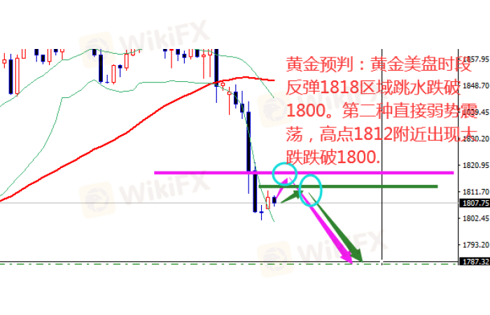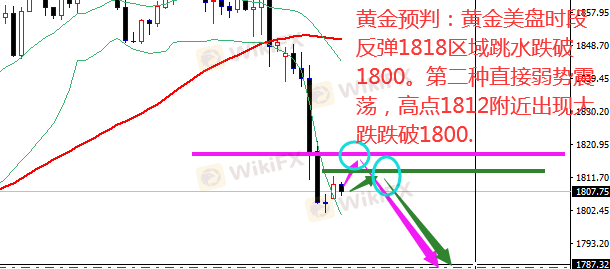 黄金今天操作还是以主控思路进场,预期白盘会继续震荡盘整,黄金到美盘可能会拉高上方受阻1818区域回落跌破1800.或者是直接跌破1800两种走势。