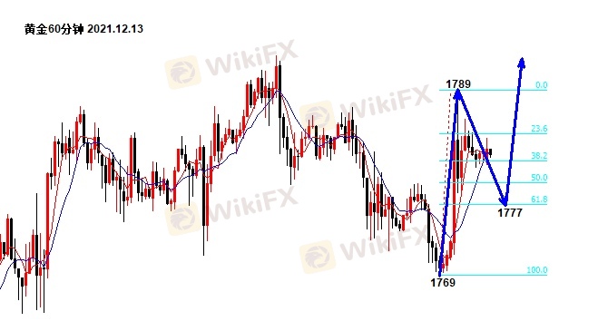 我们看黄金60分钟走势图,上周五高点在1789-90,这个位置破位便有机会测试1793-94;上周五低点在1769-70,因为反弹力度特别大,我不认为今天可以跌破,也可以理解为,以1769-70为分水岭逢低做多。