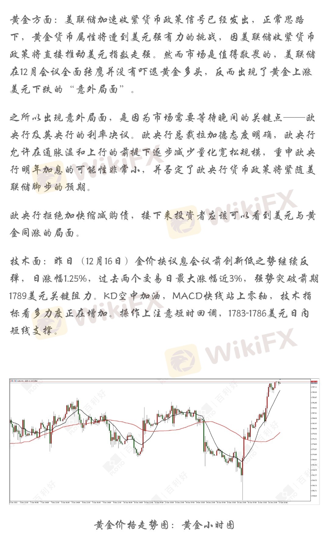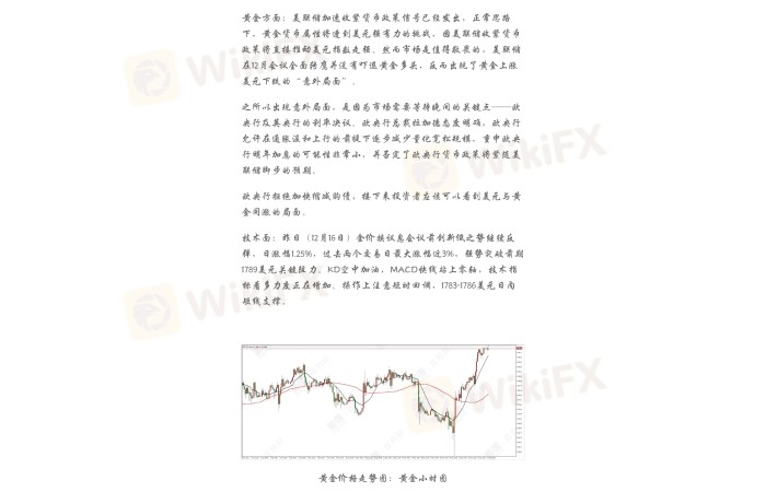 技术面:昨日(12月16日)金价挟议息会议前创新低之势继续反弹,日涨幅1.25%,过去两个交易日最大涨幅近3%,强势突破前期1789美元关键阻力。KD空中加油,MACD快线站上零轴,技术指标看多力度正在增加。操作上注意短时回调,1783-1786美元日内短线支撑。