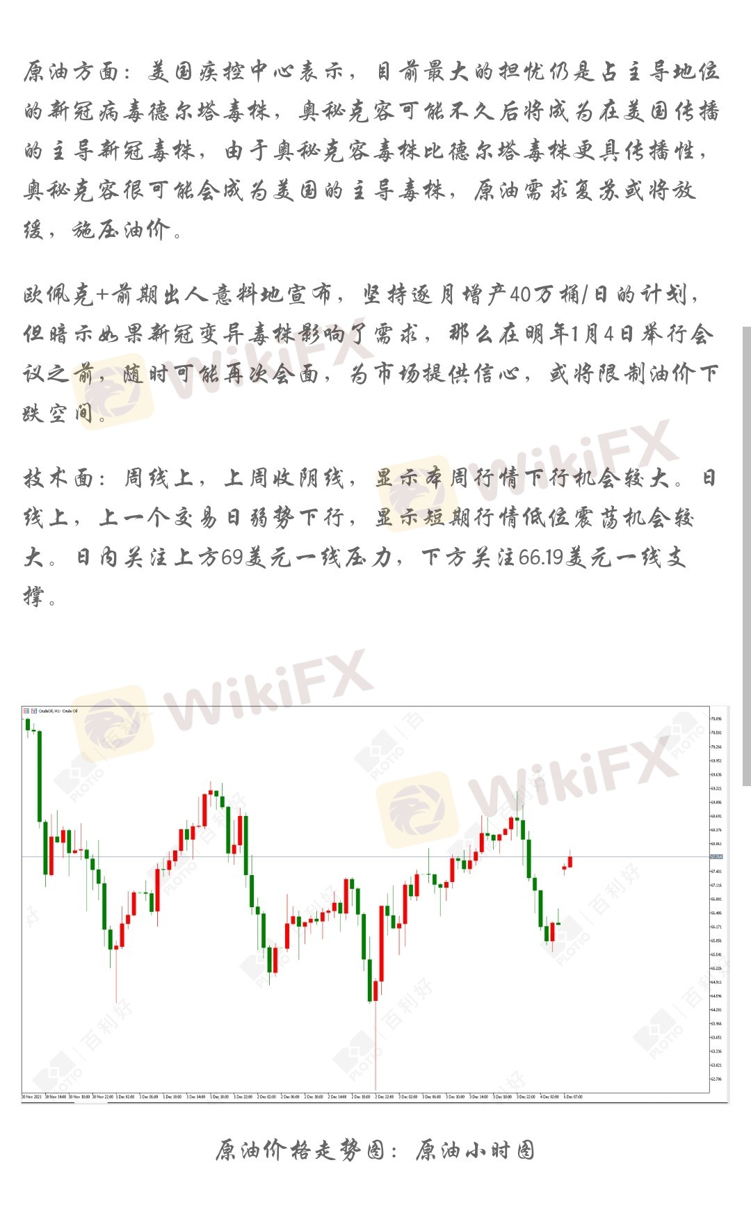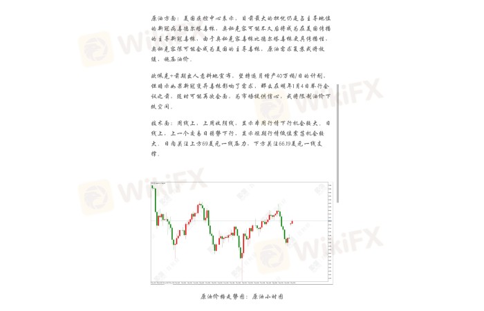 技术面:周线上,上周收阴线,显示本周行情下行机会较大。日线上,上一个交易日弱势下行,显示短期行情低位震荡机会较大。日内关注上方69美元一线压力,下方关注66.19美元一线支撑。