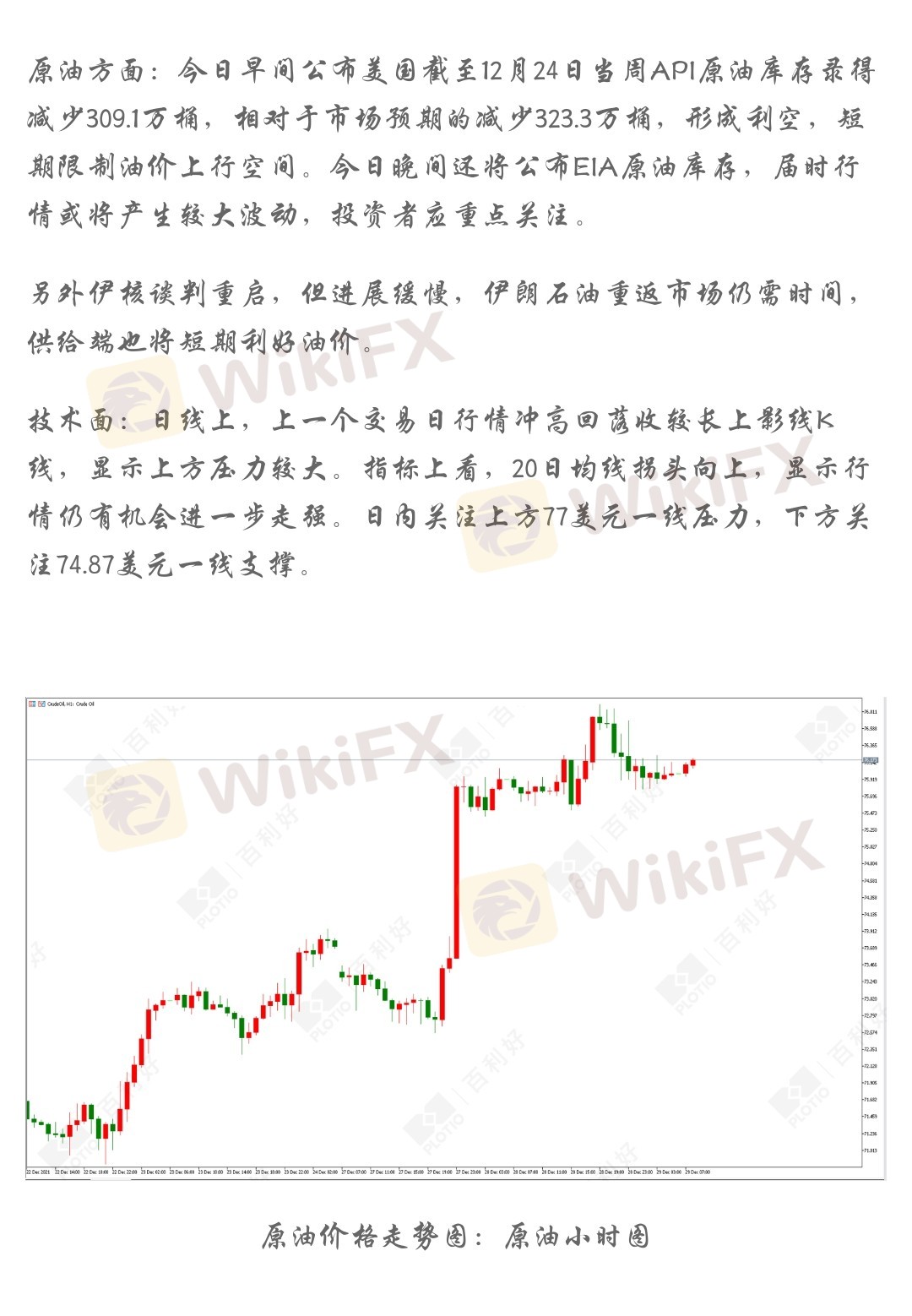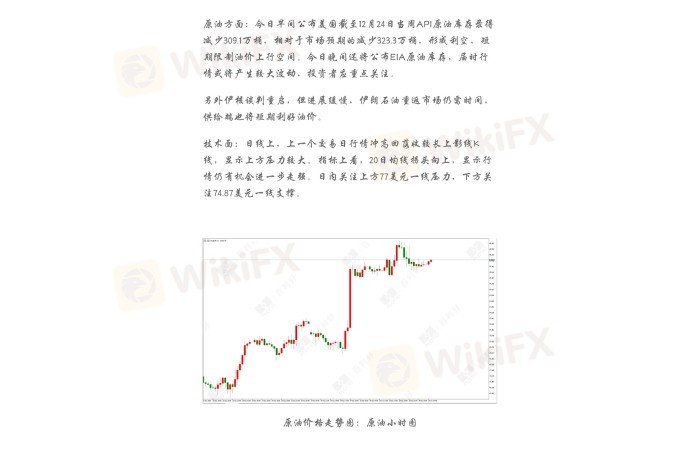 技术面:日线上,上一个交易日行情冲高回落收较长上影线K线,显示上方压力较大。指标上看,20日均线拐头向上,显示行情仍有机会进一步走强。日内关注上方77美元一线压力,下方关注74.87美元一线支撑。