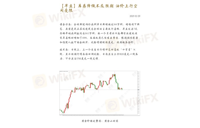 技术面:日线上,上一个交易日行情冲高回落收“十字星”K线,显示短期行情面临回调风险。日内关注上方1820美元一线压力,下方关注1790美元一线支撑。