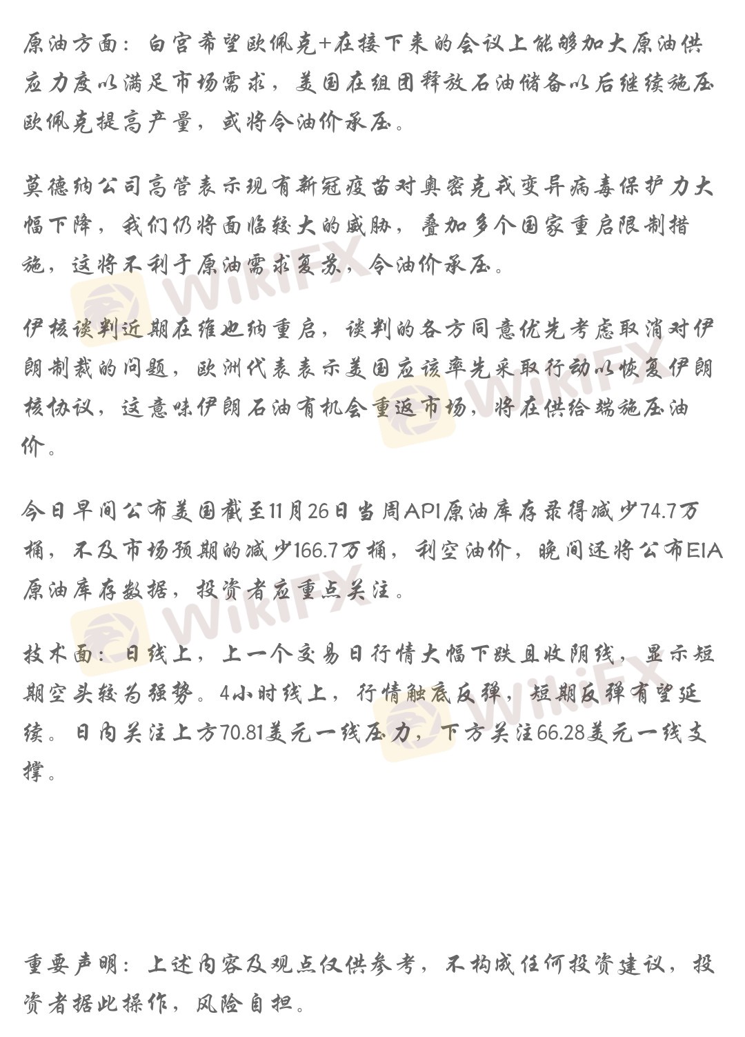 技术面:日线上,上一个交易日行情大幅下跌且收阴线,显示短期空头较为强势。4小时线上,行情触底反弹,短期反弹有望延续。日内关注上方70.81美元一线压力,下方关注66.28美元一线支撑。