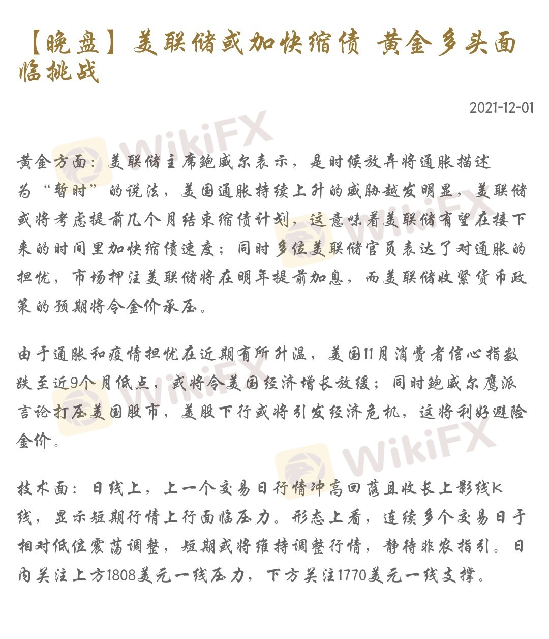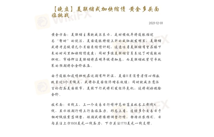 黄金方面:美联储主席鲍威尔表示,是时候放弃将通胀描述为“暂时”的说法,美国通胀持续上升的威胁越发明显,美联储或将考虑提前几个月结束缩债计划,这意味着美联储有望在接下来的时间里加快缩债速度;同时多位美联储官员表达了对通胀的担忧,市场押注美联储将在明年提前加息,而美联储收紧货币政策的预期将令金价承压。