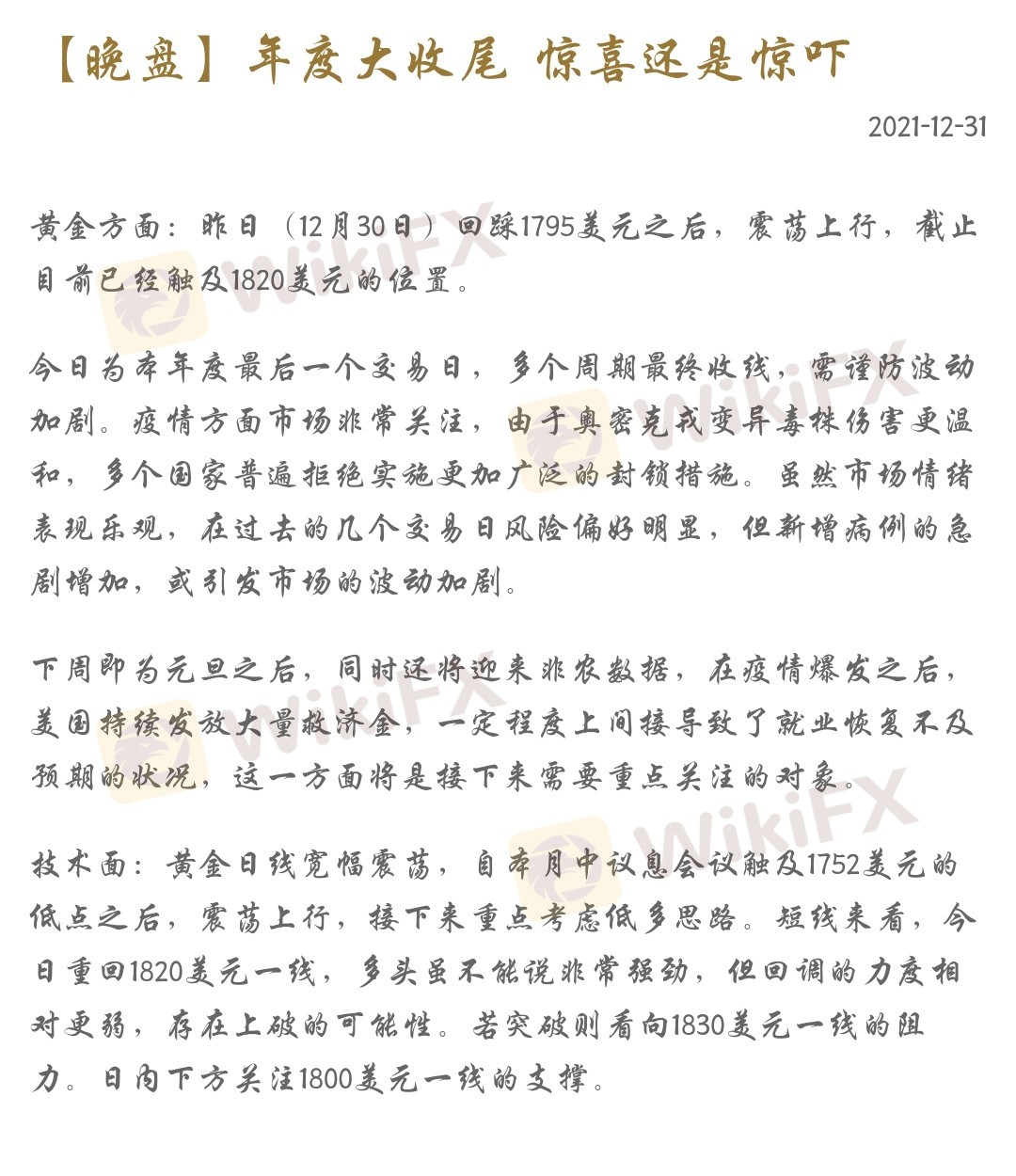 今日为本年度最后一个交易日,多个周期最终收线,需谨防波动加剧。疫情方面市场非常关注,由于奥密克戎变异毒株伤害更温和,多个国家普遍拒绝实施更加广泛的封锁措施。虽然市场情绪表现乐观,在过去的几个交易日风险偏好明显,但新增病例的急剧增加,或引发市场的波动加剧。