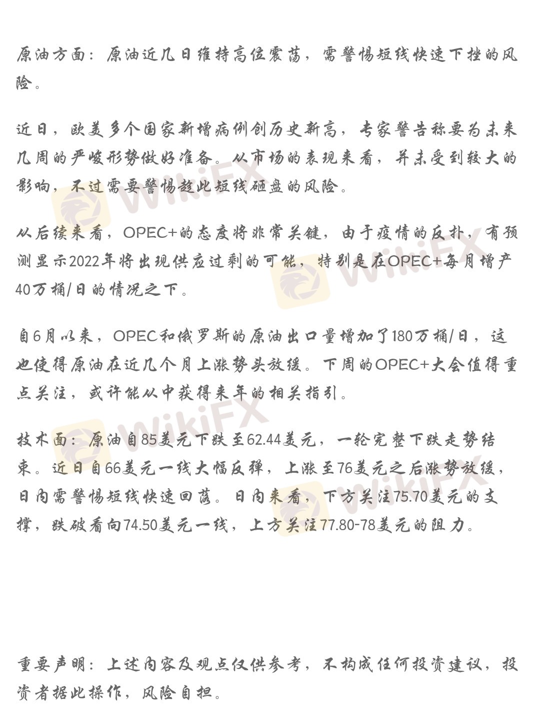 技术面:原油自85美元下跌至62.44美元,一轮完整下跌走势结束。近日自66美元一线大幅反弹,上涨至76美元之后涨势放缓,日内需警惕短线快速回落。日内来看,下方关注75.70美元的支撑,跌破看向74.50美元一线,上方关注77.80-78美元的阻力。