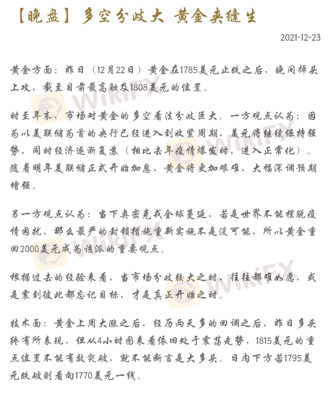 黄金方面:昨日(12月22日)黄金在1785美元止跌之后,晚间掉头上攻,截至目前最高触及1808美元的位置。