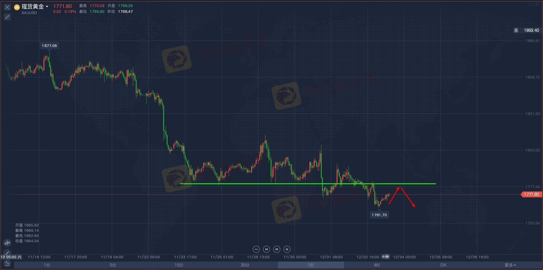 今天是周五,晚间就要公布一个月一次的非农数据了,如果说今天晚间没有数据或者其他消息面,那么今天黄金就很好操作了,调整继续空,本周一黄金冲高回落,跌破日线60日均线1790支撑,随后都是冲高回落的走势,连续收取长上引线的K柱,逐渐走跌,而且大部分都是阴柱,所以目前黄金跌破日线60日均线后,远离60日均线压制,趋势看空完全没有问题。早间开盘,黄金从低位1761开始反弹,小时周期震荡慢涨,短线调整,4小时周期来看,低位十字星,是反转信号,而且是经过确认的信号,所以总结来说,日内亚欧盘是要先考虑反弹调整走势,压制点位在10日均线1775附近,防守点位在中轨1780,给出机会可以直接考虑空,下方那个支撑先看1767附近。重点则是晚间的非农行情。