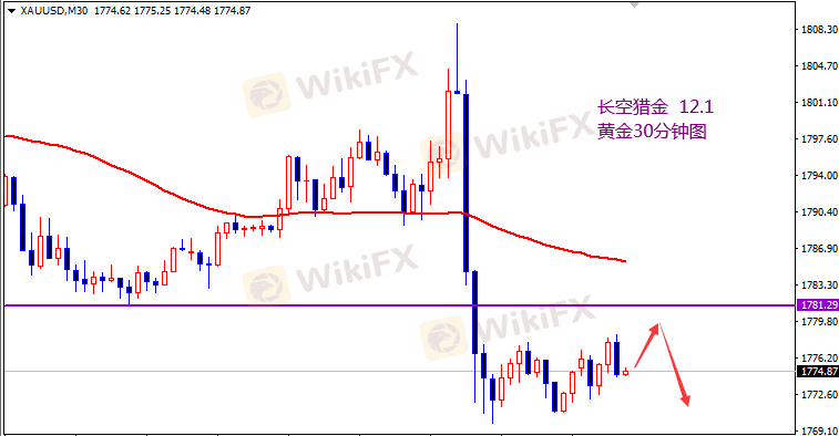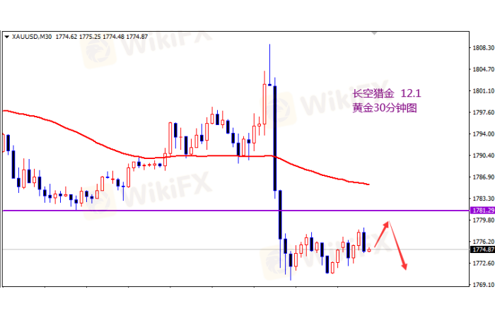 消息面上,美联储主席鲍威尔对于加息的鹰派发言,美指得到大幅提振,黄金一路砸盘快速下跌至1770附近,幅度差不多40美金。