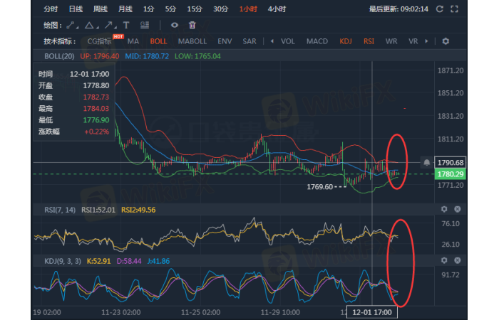 黄金技术面上看,金价跌破上行趋势线的支撑以及11月24日的震荡区间最低位,在RSI超卖的背景下,行情可能有小幅的修正,空头似乎更占优势。小时图看,目前布林带收口阶段,上方关注上轨1791一线阻力,下方1777跌破会去寻找前日低点1770.
