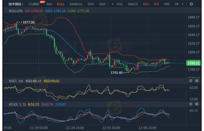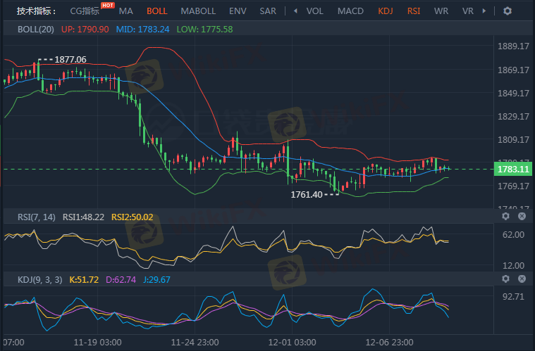 周三(12月8日)亚市盘中,黄金温和上涨,在突破1790之后遇阻开始回落,下方在1780支撑,随后徘徊于80-90区间,行情不算特别大的波动,最终收出一根上下影线的阴十字。