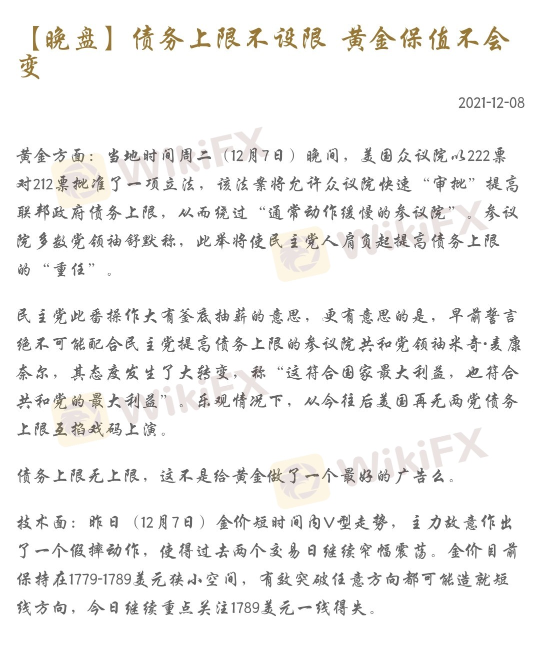 【晚盘】债务上限不设限 黄金保值不会变