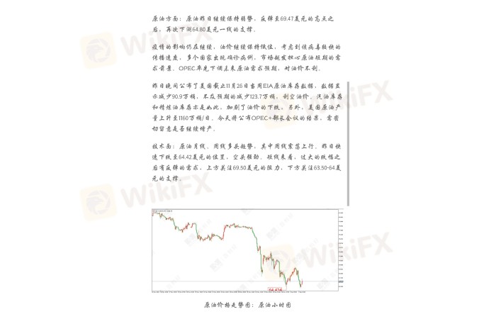 技术面:原油月线、周线多头趋势,其中周线震荡上行。昨日快速下跌至64.42美元的位置,空头强劲。短线来看,过大的跌幅之后有反弹的需求,上方关注69.50美元的阻力,下方关注63.50-64美元的支撑。