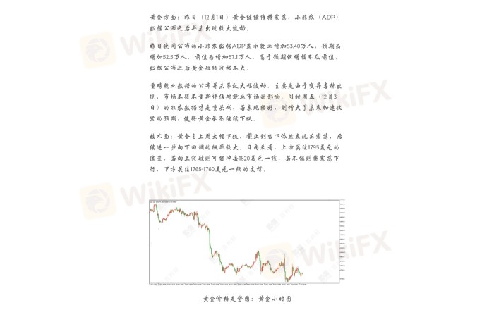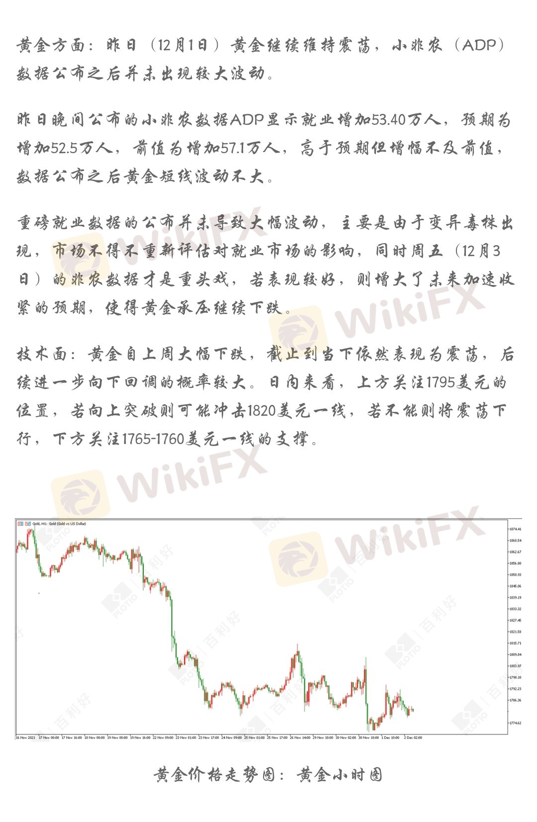 黄金方面:昨日(12月1日)黄金继续维持震荡,小非农(ADP)数据公布之后并未出现较大波动。