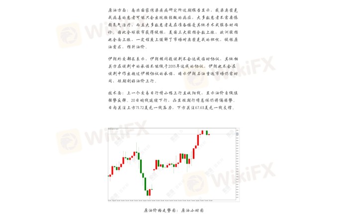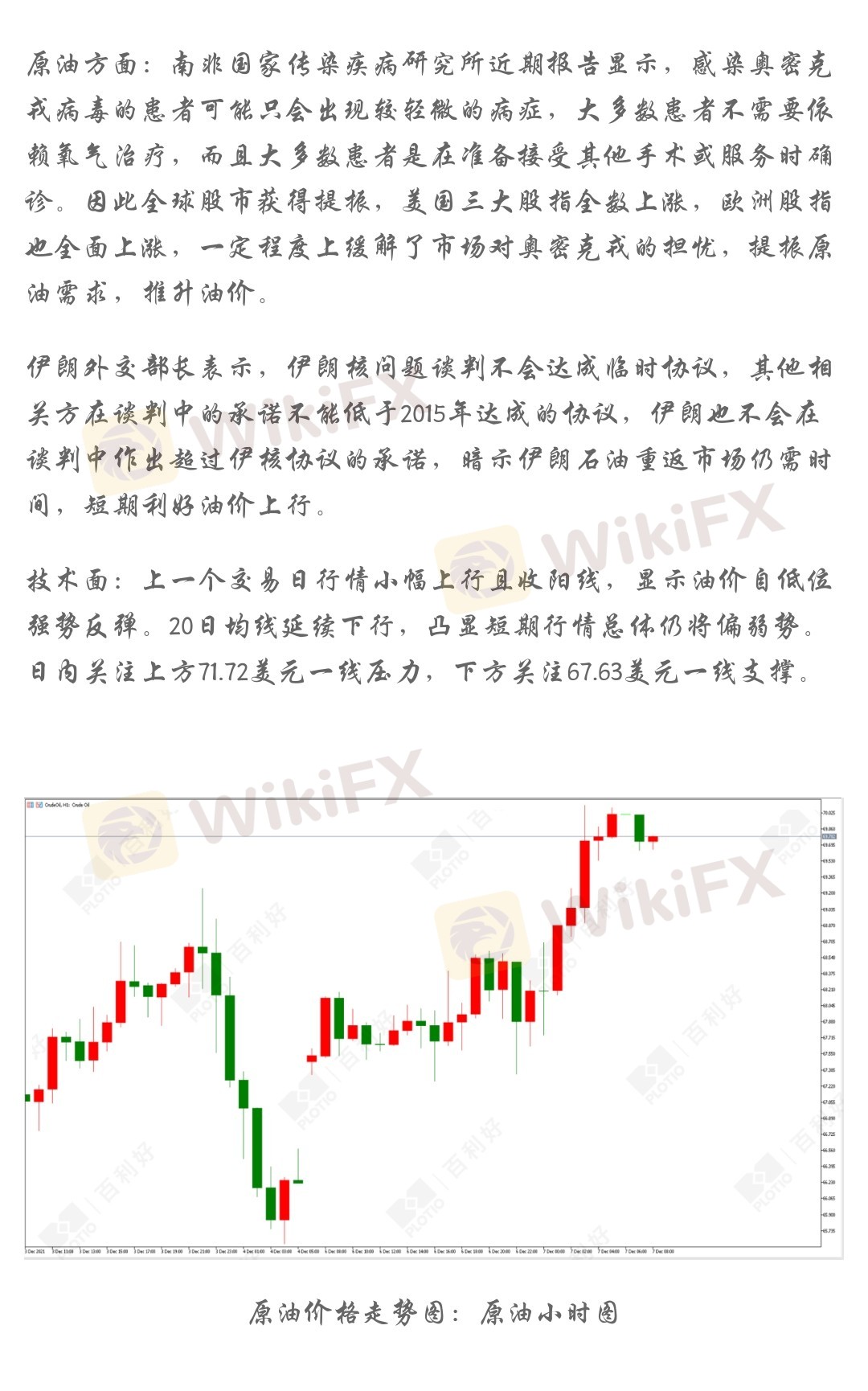 技术面:上一个交易日行情小幅上行且收阳线,显示油价自低位强势反弹。20日均线延续下行,凸显短期行情总体仍将偏弱势。日内关注上方71.72美元一线压力,下方关注67.63美元一线支撑。