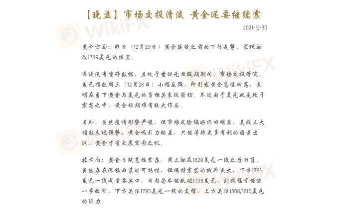 黄金方面:昨日(12月29日)黄金延续之前的下行走势,最低触及1789美元的位置。