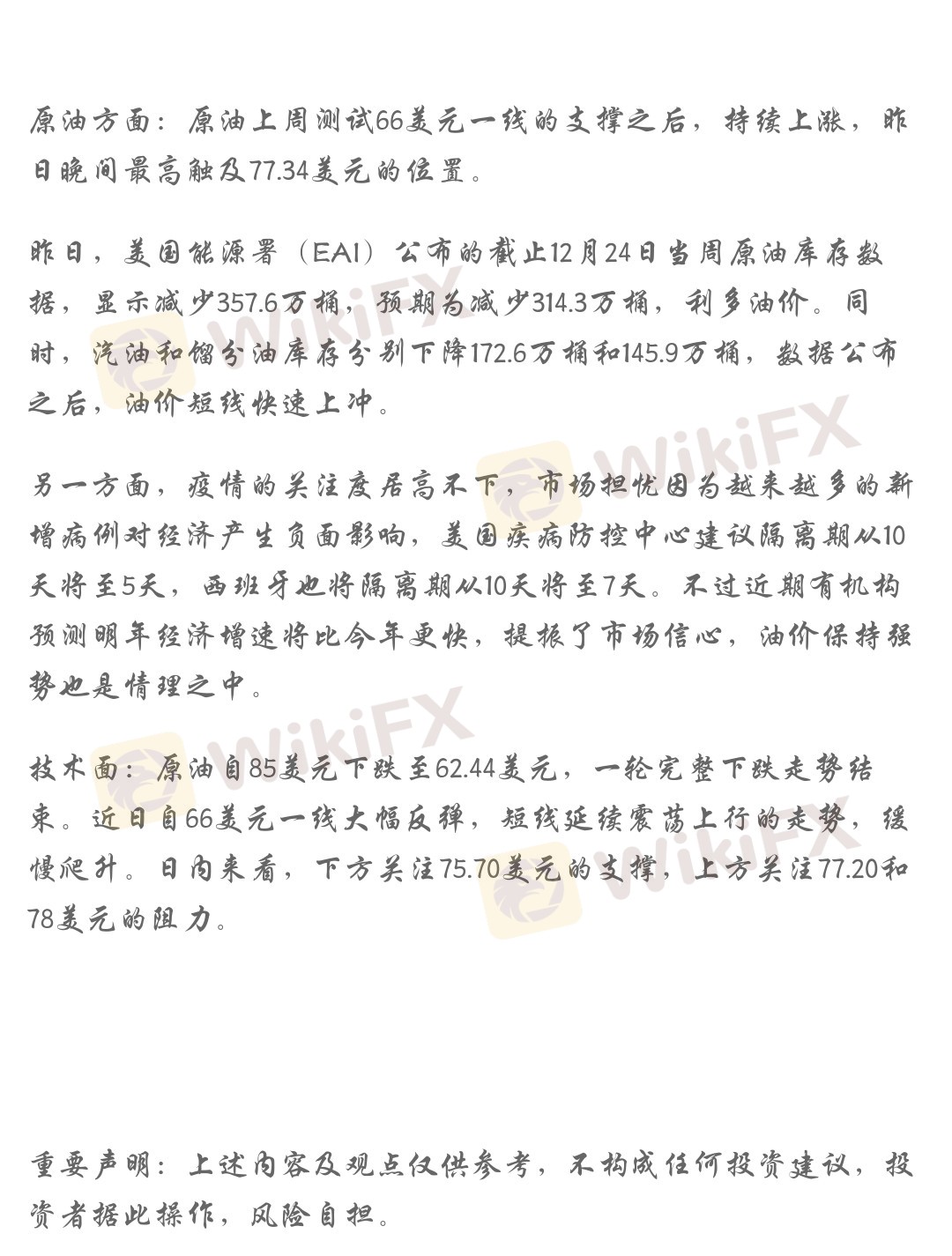 昨日,美国能源署(EAI)公布的截止12月24日当周原油库存数据,显示减少357.6万桶,预期为减少314.3万桶,利多油价。同时,汽油和馏分油库存分别下降172.6万桶和145.9万桶,数据公布之后,油价短线快速上冲。