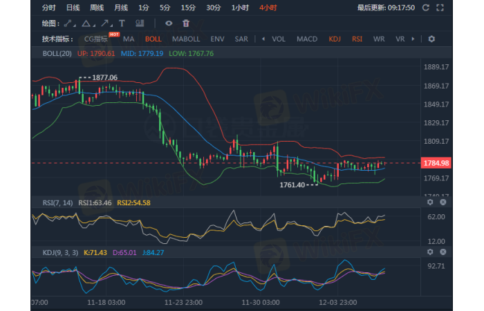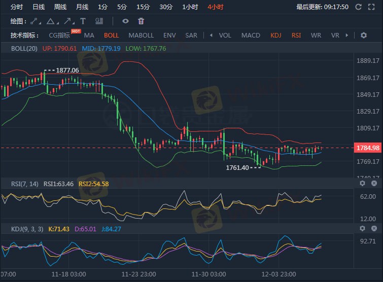 周二(12月7日)美盘,国际金价探底回升,盘中最低下跌至1772.1一线,最高反弹至1787.6一线,目前黄金小幅回落交投于1785一线,小阳收线,单日涨幅6个点。