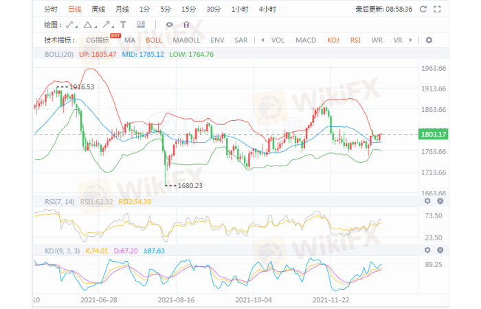 日线图看,布林带处于即将开口状态,昨日一根小阳线贯穿了布林带中轨和上轨之间的区间,目前是上轨压制状态,KDJ RSI均是在继续向上超买区域中。行情总体上趋于继续区间整理。