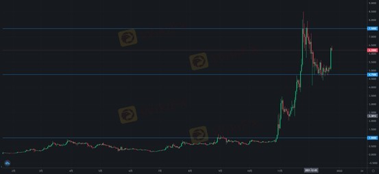日线图,10月28日元宇宙概念大爆发,SAND币一月内暴涨十倍。过去一月,一度腰斩,4.75强支撑。周四长阳,本轮调整大概率结束。SAND币的中长期上涨趋势不变。近日建议参考5.8止损,逢低做多。免责声明:以上为NCE分析师个人观点,仅供参考,并不代表NCE对于投资者的任何直接操作建议,投资者据此入市风险自负。NCE官网:https://www.nceprime.com