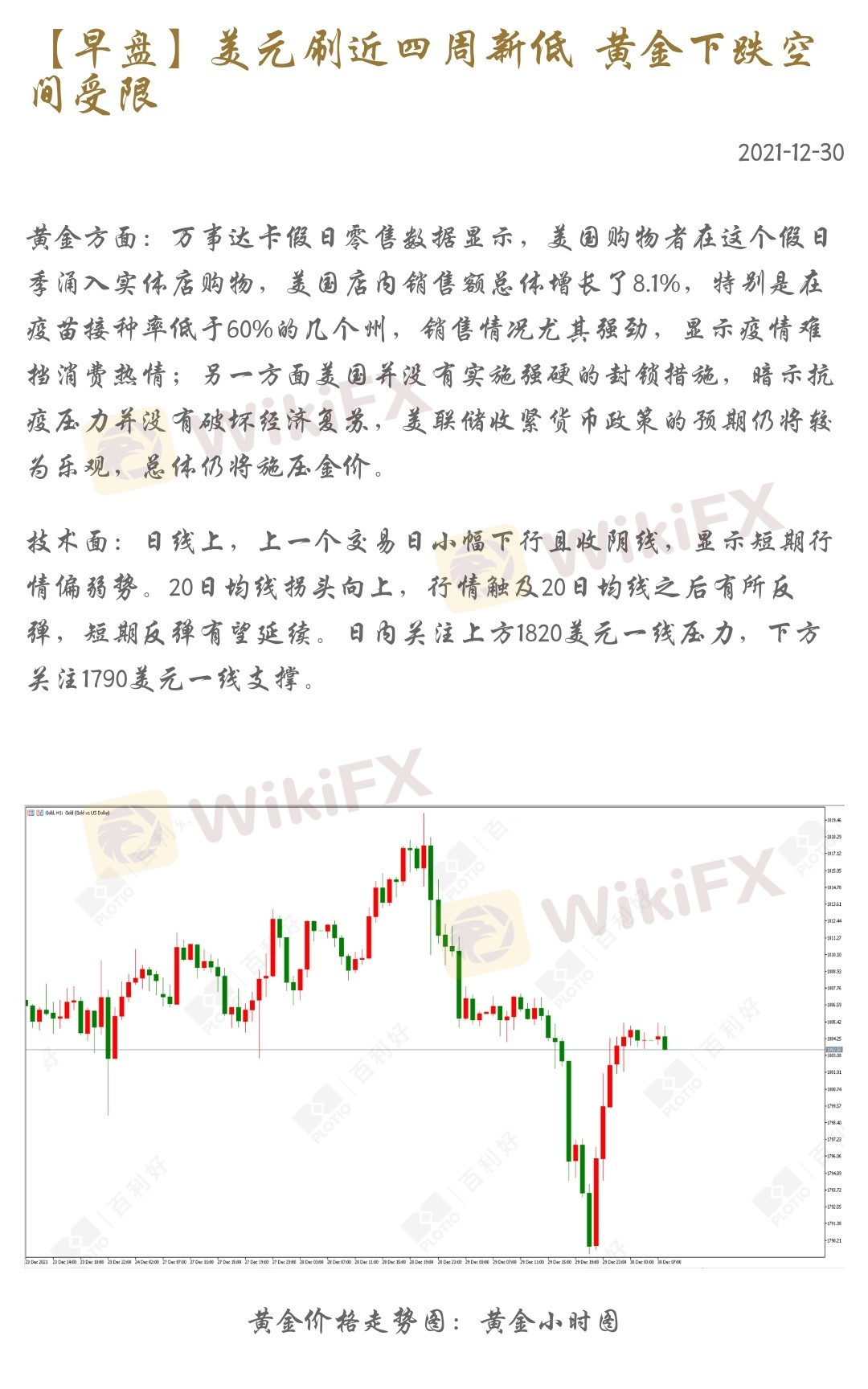 技术面:日线上,上一个交易日小幅下行且收阴线,显示短期行情偏弱势。20日均线拐头向上,行情触及20日均线之后有所反弹,短期反弹有望延续。日内关注上方1820美元一线压力,下方关注1790美元一线支撑。