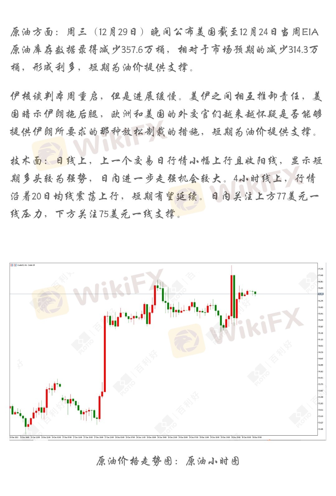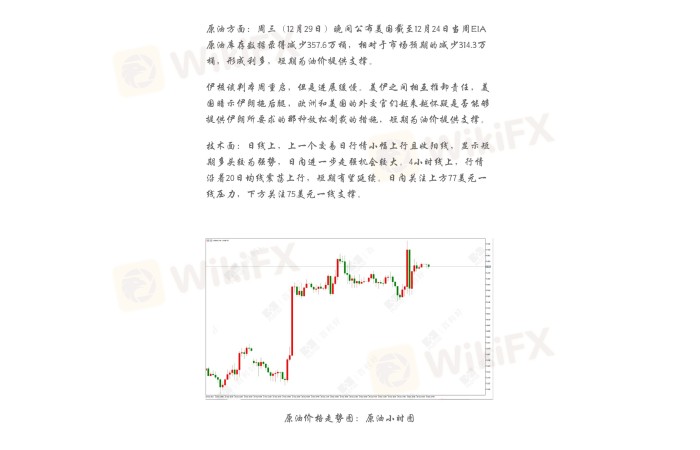 技术面:日线上,上一个交易日行情小幅上行且收阳线,显示短期多头较为强势,日内进一步走强机会较大。4小时线上,行情沿着20日均线震荡上行,短期有望延续。日内关注上方77美元一线压力,下方关注75美元一线支撑。