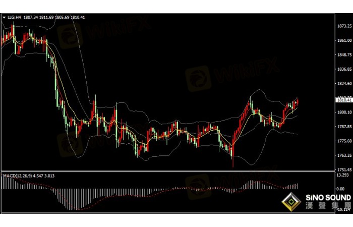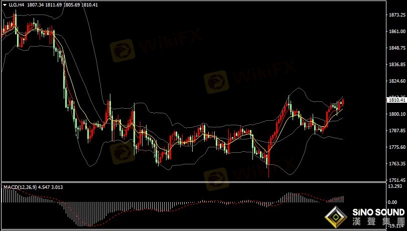 金价4小时图看,金价在沿布林上轨振荡向上,短期均线EMA5与EMA10双线形成多头持续向上。MACD指标正动能柱持续,RSI指标在超买线70位置下方持续徘徊。当前金价主要支撑位在1800关口上方,金价上行阻力将在前期高点1815,假如突破这一阻力位,金价有望进一步升向1823-1825区间。