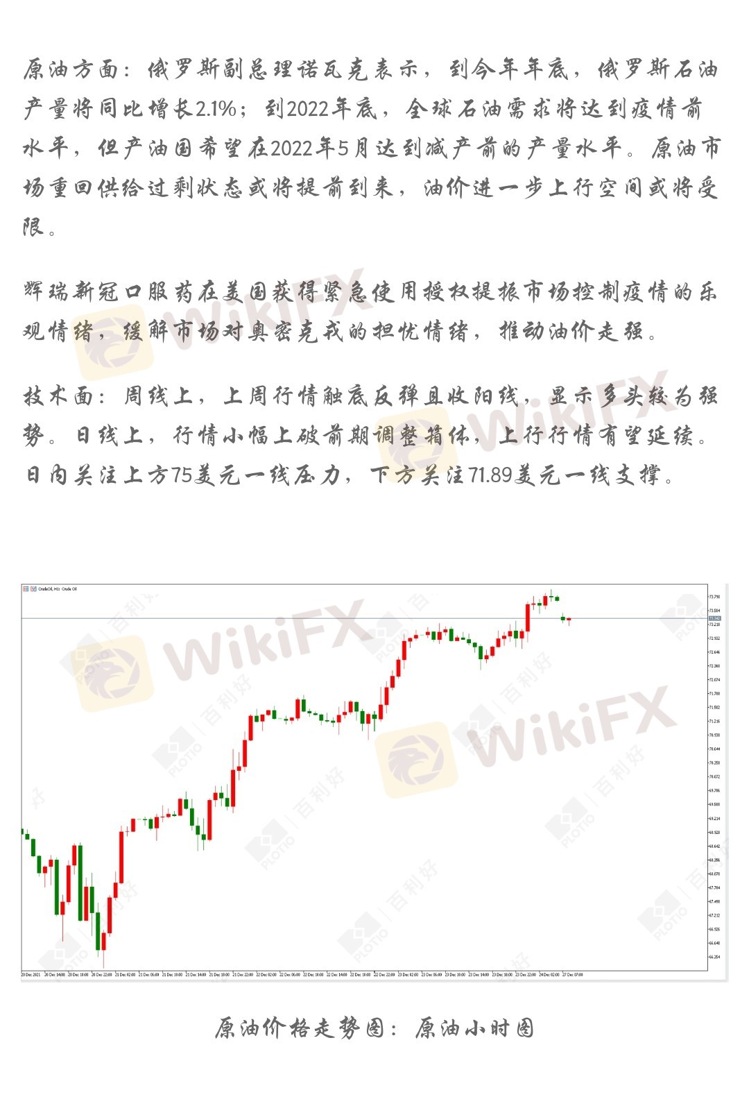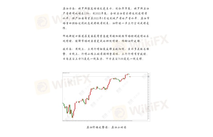 技术面:周线上,上周行情触底反弹且收阳线,显示多头较为强势。日线上,行情小幅上破前期调整箱体,上行行情有望延续。日内关注上方75美元一线压力,下方关注71.89美元一线支撑。