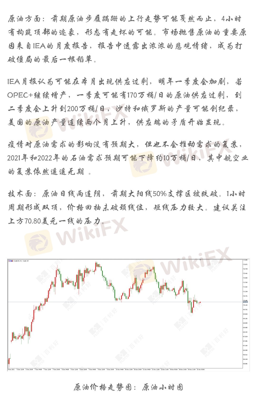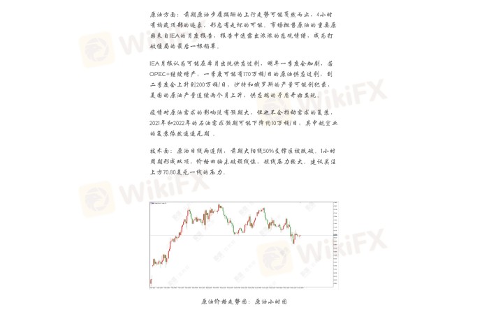 技术面:原油日线两连阴,前期大阳线50%支撑区被跌破。1小时周期形成双顶,价格回抽未破颈线位,短线压力较大。建议关注上方70.80美元一线的压力。