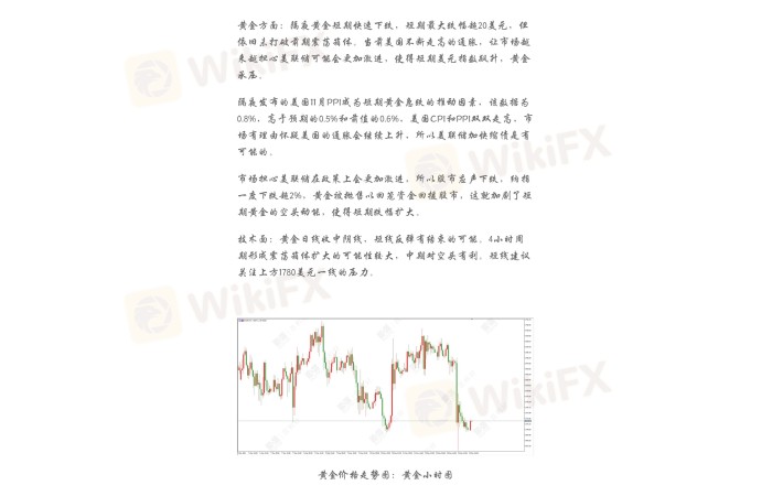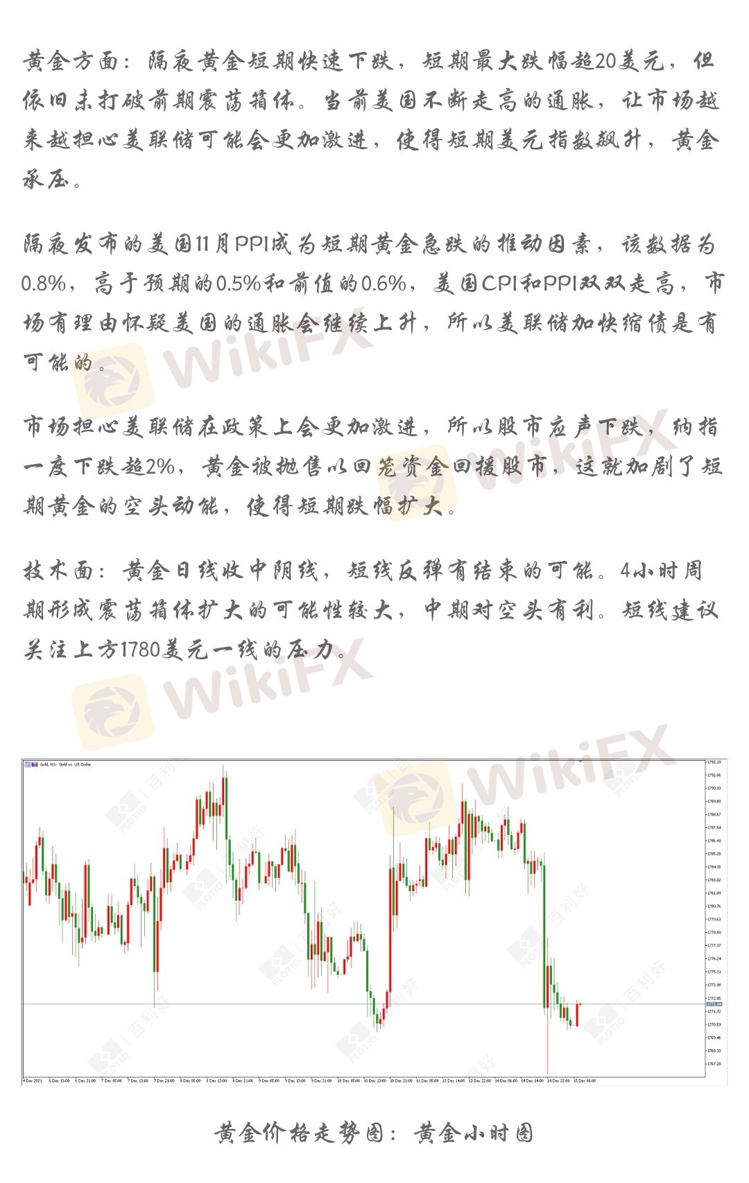 隔夜发布的美国11月PPI成为短期黄金急跌的推动因素,该数据为0.8%,高于预期的0.5%和前值的0.6%,美国CPI和PPI双双走高,市场有理由怀疑美国的通胀会继续上升,所以美联储加快缩债是有可能的。