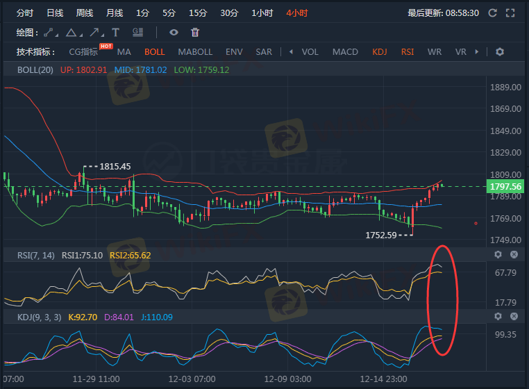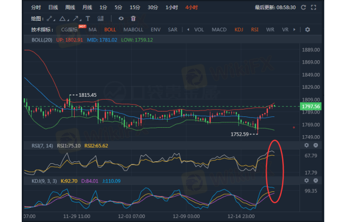 从日线来看,现货黄金周四维持涨势,正在考验1800整数关口,金价周三大幅下探后止跌反弹,尽管美联储如预期所料转鹰,但鹰派程度大体在市场预期之内。下方支撑强劲,多头有望延续1753反弹以来的涨势。若强势收复1800大关那么近期的颓势将得到彻底扭转,反之如果冲高回落甚至收跌,则意味着金价仍将继续横盘震荡。四小时来看,金价伴随着快速的下探回升。短线继续关注1800的防守,不破上轨仍是看在区间内震荡,反之若突破该区域防守将决定上行空间的关键位置。