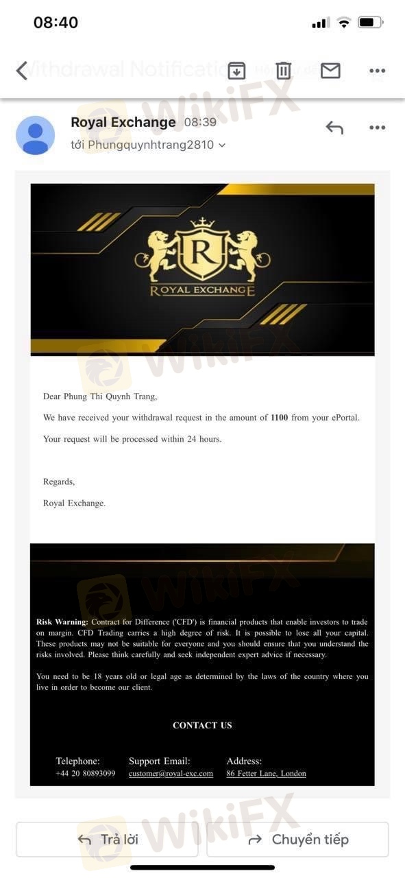 Sàn ROYAL EXCHANGE lừa đảo, giải quyết không thoả đáng cho NĐT.