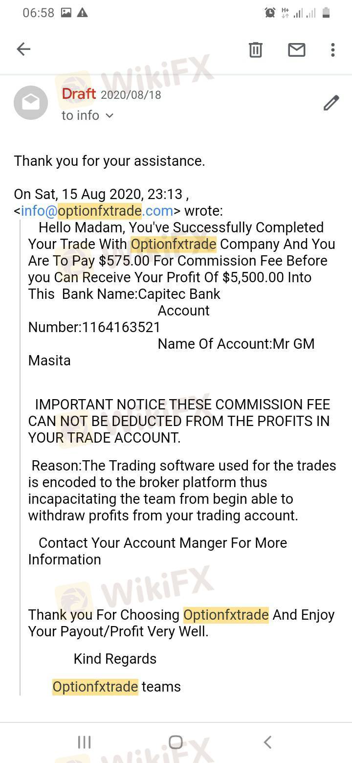 Hello, I Gabriel Masita from South Africa, I invested my money with optionfxtrade ,they guy is said to be Matthew Lawson. The money I have already paid to this company is R45000,everytime this guy will ask me to deposit money through luno, after I paid the money he requested he ask for another deposit to the point it reached R45000 ,I a have the proofs of payment, now he is requesting I pay R6000 which he claims it for shipping the money, please I need to help in recovering my money back.