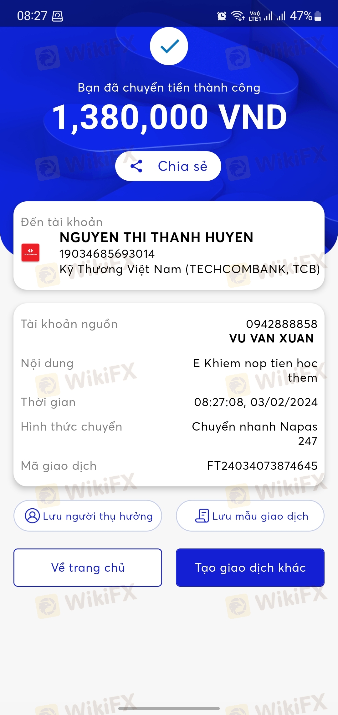 Tôi có bị nhóm này gạ gẫm vào san từ ngày 8.1.2024 với số vốn là 2040$, với gọi ý là nhận cổ tức của mã cp DEQ, nhưng khi đc chia cổ tức thì sàn nó tính sai giá chốt và giá vào lệnh nên tôi bị trừ sạch cổ tức. may mắn là chốt nhanh ko thì âm tài khoản. Sau tôi có kêu lên nhân viên hỗ trợ là Lâm Nhật và ko giải quyết đc. Tôi đành ngậm ngùi mất tiền vì sàn bẩn. Sau đó trở đi đến ngày 30.1.2024, tôi đã giao dịch đạt được tính cả lợi nhuận và gốc là 3621.19$. Tôi có đặt lệnh rút 3620.65$ từ 10h đêm ngày 30.1.2024, đến tận ngày 2.2.2024 tôi vẫn chưa nhận đc tiền về tài khoản. Sau khi trao đổi với ng hỗ trợ là Lâm Nhật, bạn này có bảo để gọi hỏi sàn. Sau đó có ng gọi cho tôi bằng số: 0598400723 bảo là giao dịch rút tiền bị chậm do qua cổng rút gì đó và phí rất cao đến 40%, nên bảo tôi làm theo cách của họ để rút ko bị mất phí. Nguoi này có huog dân tôi vào buy và sell 0.3 lot mã COTTON, sau 15 phut sẽ giải tỏa 2 lệnh này. Tôi cug chưa tin tưởng nên chưa làm theo và gọi tổng đài hỗ trợ số: 1900252238 để xác minh xem đúng nhân viên sàn ko. TĐ sàn có bảo để kiểm tra, sau đó ngày hôm sau vẫn ko gọi lại để xác nhận đúng là người của sàn hay ko. Tôi có gọi lại tổng đài nhug ko thể gọi được. Đúng lúc đó thì nhân viên hỗ trợ nạp rút lại gọi cho tôi giục vào 2 lệnh buy sell 0.3 lot mã COTTON đi để họ giúp rút tiền. Do ko liên lạc đc với tổng đài xác minh nhân viên này nên tôi đành chấp nhận vào lệnh như họ nói. Sau khi tôi vào lệnh thì âm 4500$ trạng thái mà giờ vẫn treo ko dám cắt. Sau đó người hỗ trợ tôi có bảo giờ a muốn rut tien thì phải nạp thêm 4500$ để cân bằng số đag âm, sau đó rút tiền. Tôi thấy rất vô lý và ko làm theo.