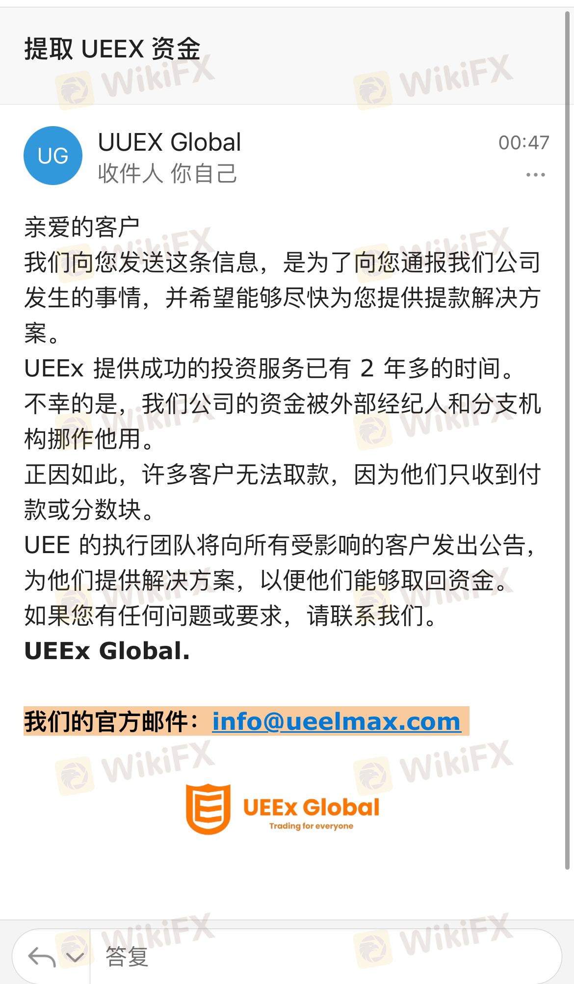 他们不让我取款,并停止给我写信,因为我拒绝支付信用评分。 一个月过去了,UEEx 总部给我发了一条信息,解释了发生的事情,并说关于信用评分的事情是谎言。分行代理才是实施欺诈的人,现在 UEEx 说他们将帮助客户提取资金。