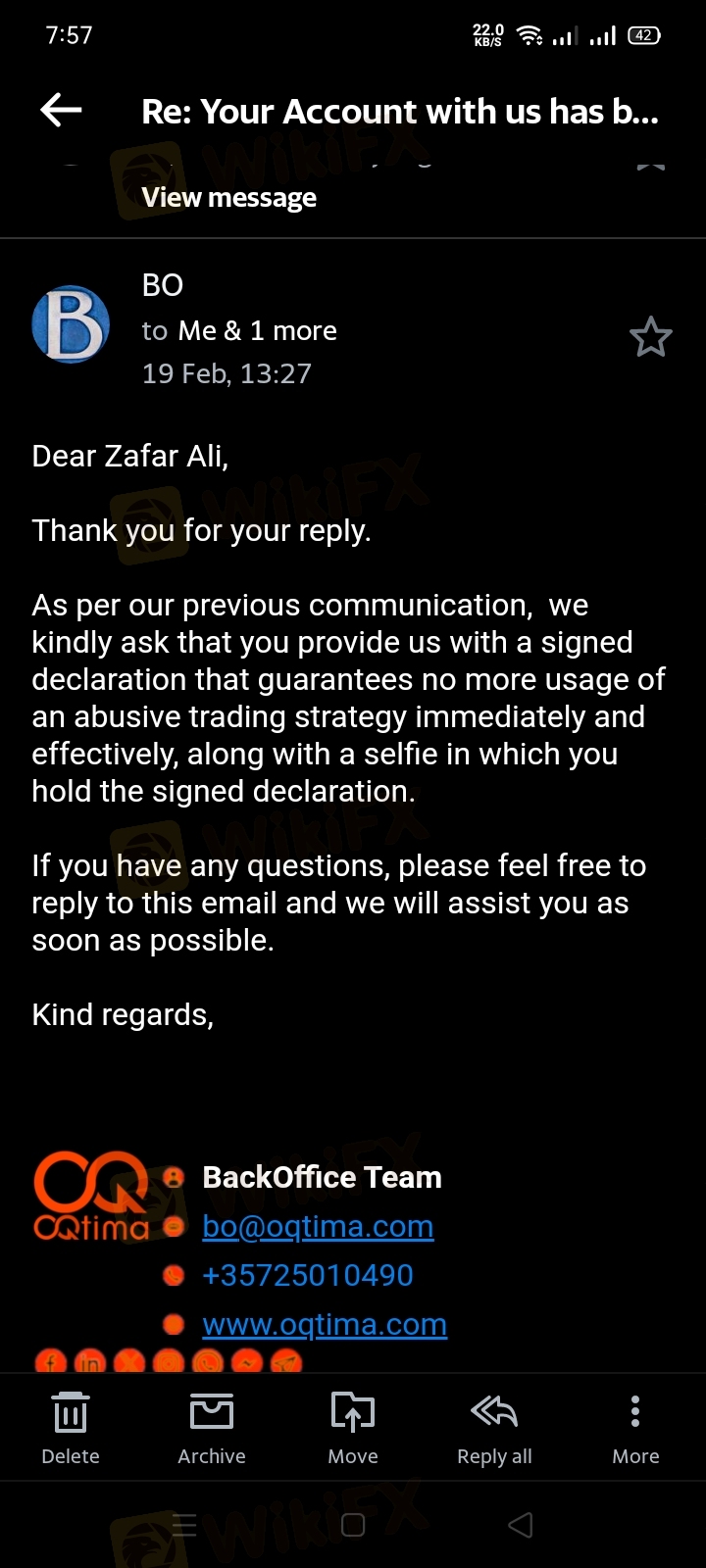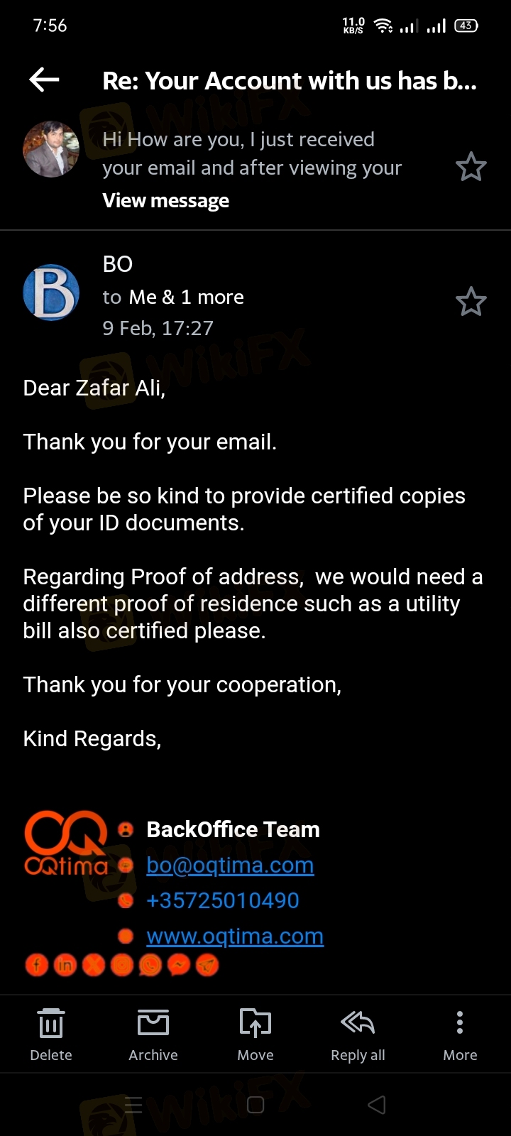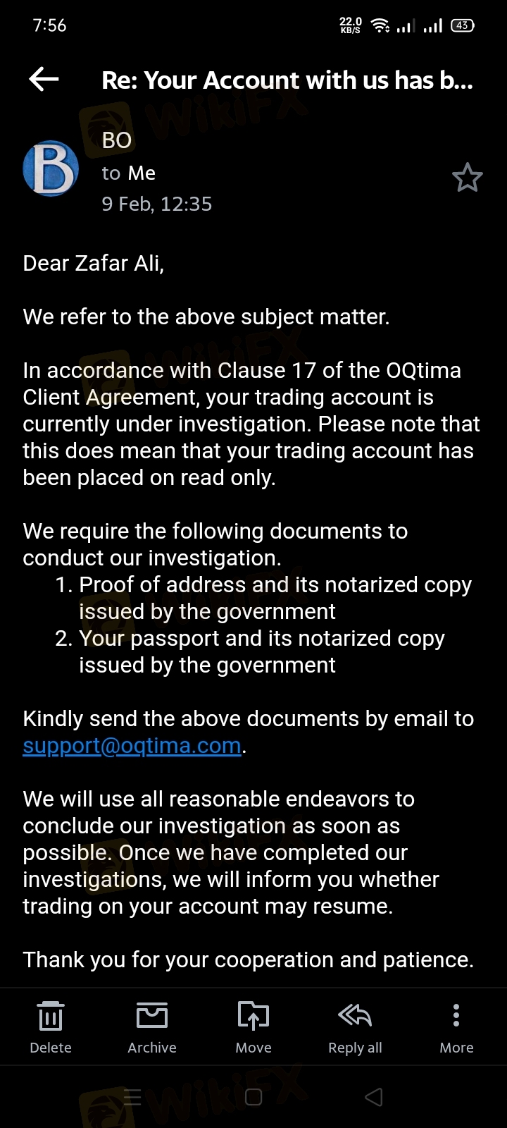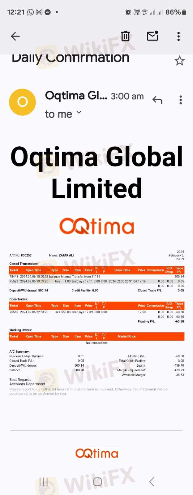 Hi my name is zafar ali. My registered account at oqtima broker is azafar46@yahoo.com. Oqtima broker is a scammer broker. Here is my review about this Oqtima Global broker. when i deposit lost 600$ in US shares Trading before, they returned my remaining balance of 100$. And after few days When i deposit again 500$ and trade again in us share and I do profit 2920$ in Us share Snap trading so they made excuses for illegal trades and trying to eat my profit 2920$ Since from 15 days they tortured me by demanding different documents and i provided even my account was already fully verified. This proves that it is an scammer broker. My deposit is 500$ and profit is 2920$. All forex trader listen openly This broker will never give you your profit. Everyone reading this review please withdraw your funds from this scam broker. I am going to post everywhere with all evidence of videos and screenshot. I am also opening case against them in their regulations. Admin kindly declare this broker as scam and help me to recover my 3419$.on Trust pilot reviews website few other victum of this scammer company Oqtima Global. He also told me again and again about my trading strategy in their email. What consern of this company about my trading strategy. Is regulated broker doing this. they also blocked my mt4 account and access to my portal.
