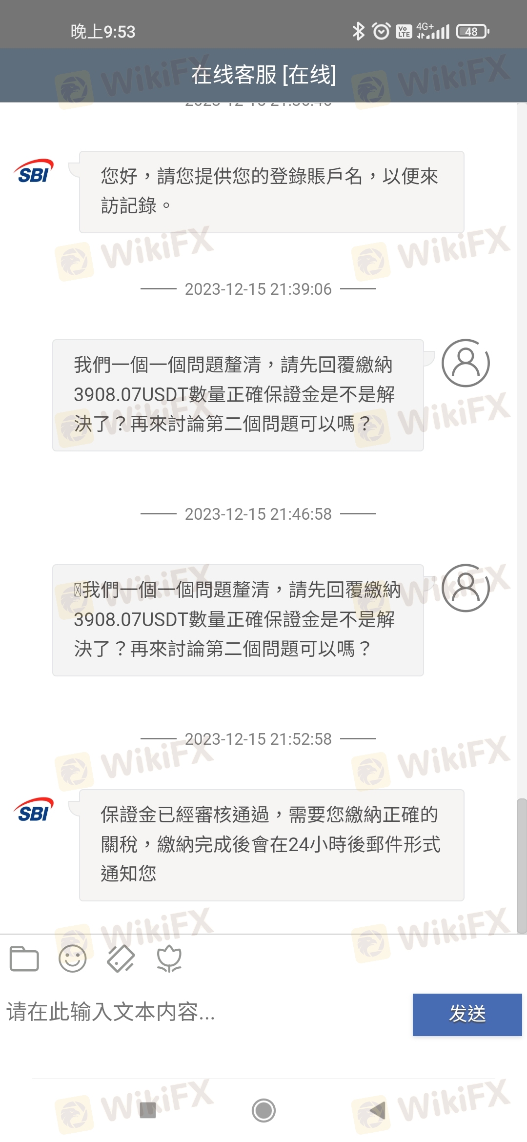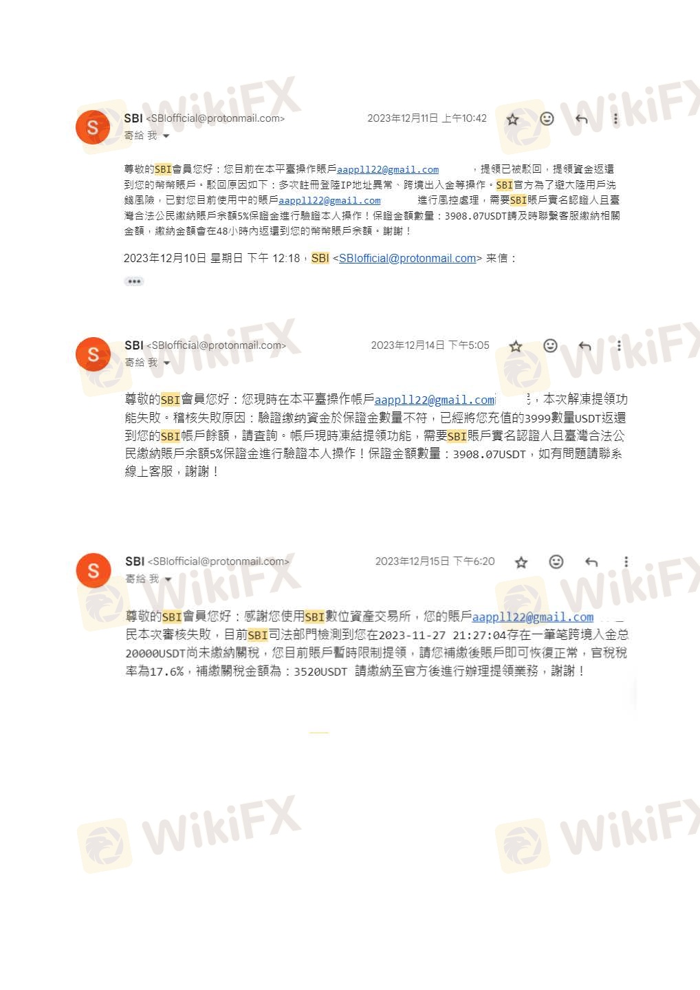 1. 交易所名稱為SBI在中國及日本都有註冊, 我在2023年11月交易時,是在下列網址 www.sbicllwllslqw.com 無法出今後發現該平台同時有另外三個網址是相通,用同一組帳號密碼都可以登入 www.sbigtr.com www.sbilamkiedjroc.com www.sbiuuolehjne.com 上述的通知信件都是SBIofficial@protonmail.com(可以比對SBI寄給我的信箱是相同的) 但2024年2月無預期關閉所有網址及APP,目前已經無法登入,2/22已信件通知停止服務2. 2023/11/3及2023/11/4分別入金1000及1,100 USDT,不會操作導致虧錢 因此在2023/11/27分別入金11696 USDT及20000 USDT(跟朋友借請其入金) 就賺錢到78161.40 USDT,然後要提領16,000 USDT, 惡夢就開始,要求繳納各種理由的稅金 (1)需要SBI賬戶實名認證人且臺灣合法公民繳納賬戶余額5%保證金進行驗證本人操作!保證金額數量:3908.07USDT 結果我入金3999 USDT,數字跟它不一樣,又補繳3908.07USDT (2)跨境入金总20000USDT尚未繳納關稅,您目前賬戶暫時限制提領,請您補繳後賬戶即可恢復正常,官稅稅率為17.6%,補繳關稅金額為:3520USDT此時我的帳戶來到89588.47 USDT(交易所將前三筆繳納的錢入到帳戶) (3)根據台灣本土2021/7/1 金管會擬定之虛擬通貨平台及交易業務事業防制洗錢及打擊資恐辦法,您目前賬戶劃分至高風險賬戶類別,SBI官方將不再為此賬戶提供服務,需要您繳納賬戶餘額6%的註銷公證金,公證金數量為5375.2482USDT (4)數筆笔TRX手續費來源於大陸資金轉入,SBI官方為了避大陸用戶洗錢風險,進行風控處理,需要臺灣合法公民繳納賬戶余額3%保證金進行驗證本人操作!保證金額數量:2687.3241USDT (5)提領地址已經為您申請備案中,SBI官方為了避用戶洗錢風險,檢測到您的賬戶綜合評分較低,需要您繳納賬戶餘額的4%作為備案地址的備案金,備案金數量為3583.4988USDT (3)-(5)筆沒有入到我帳戶,交易所就扣著 (6)一筆笔跨境入金总20000USDT盈利佔跨境資金佔比總充值額度:45.1528%近期發現洗錢人數眾多,資金來歷不明2023年2月1日起國際金融監督管理委員會實行新規,目前對您賬戶進行風控處理暫時限製提領,需要您補繳盈利關稅後賬戶即可恢復正常,官稅稅率為19.7%,補繳關稅金額為:3807.56USDT;此筆沒有繳納3. 每繳一筆稅金都有問客服是不是繳完就可以提領金額並歸還所繳納的保證金、關稅、註銷公證金等等,每次都是官方回答,當前我的帳戶僅有此筆資金需要辦理繳納,無後續資金需要繳納辦理。結果繳納後就有新的問題要繳納4. 留下這些詳細資訊,希望日後不要有人跟我一樣受騙 因為我發現它註冊網址可以使用到2024/9/22,深怕它又復活繼續詐騙 受理註冊網址的平台公司是Gname.com Pte. Ltd.5.