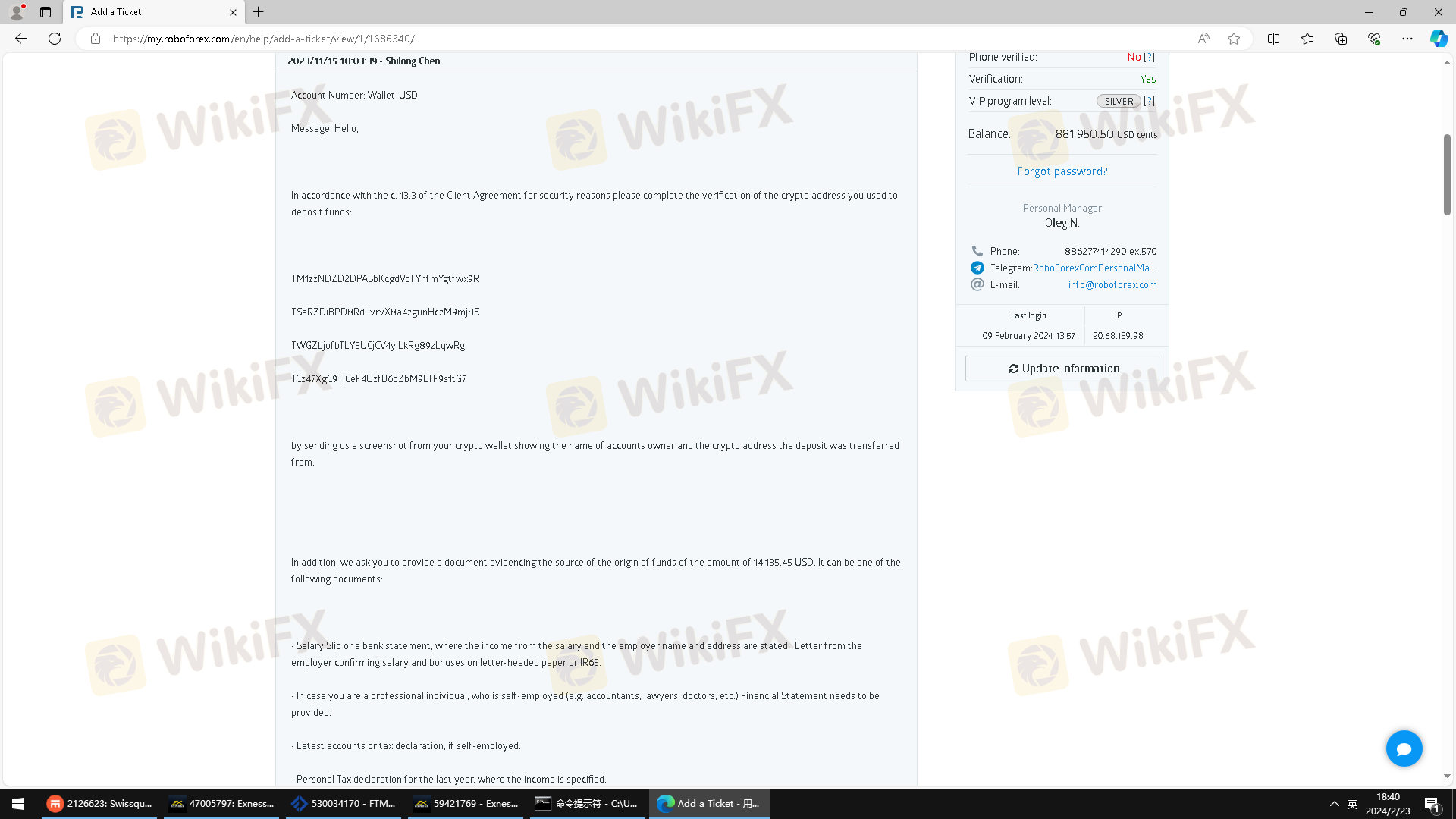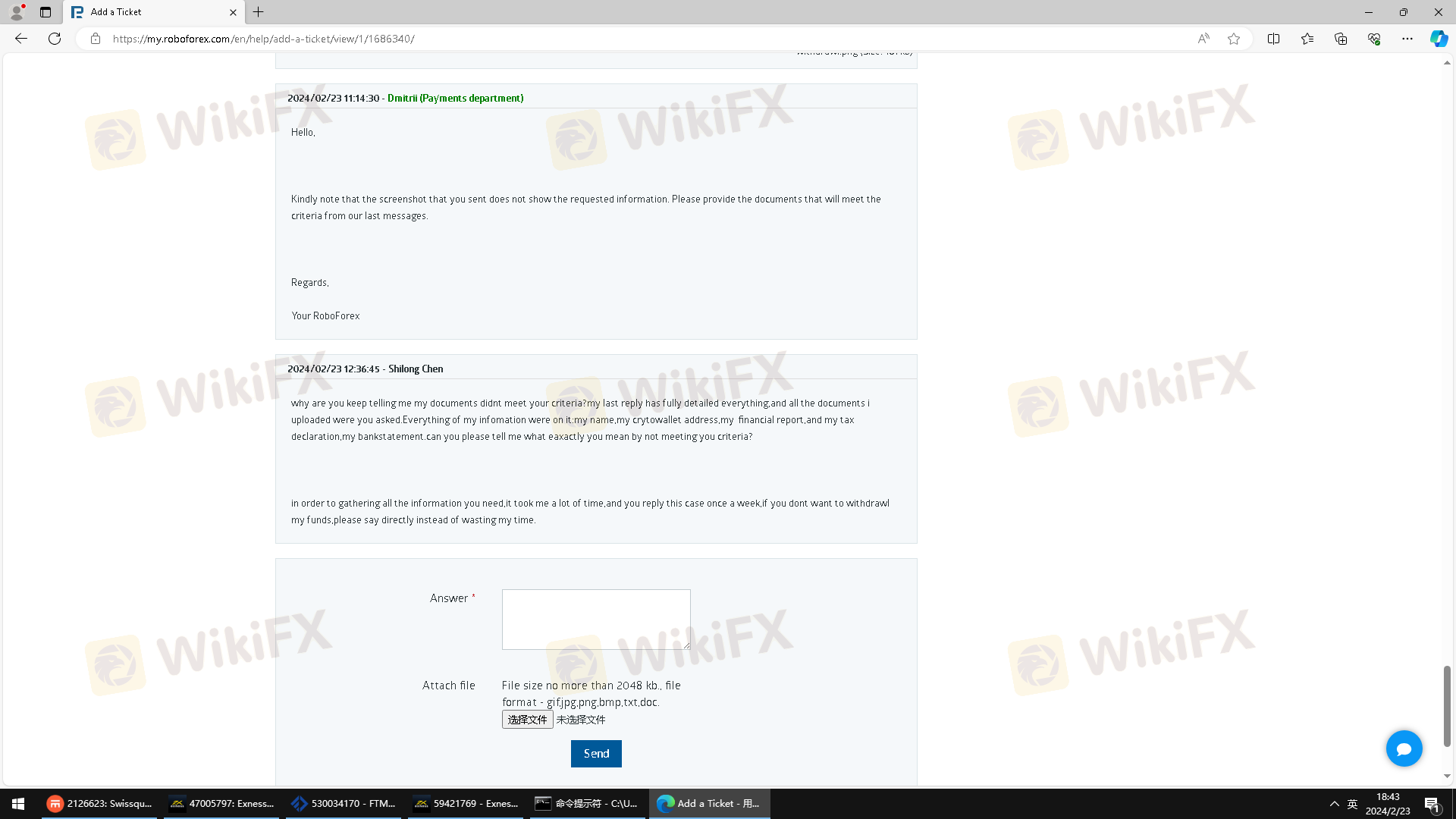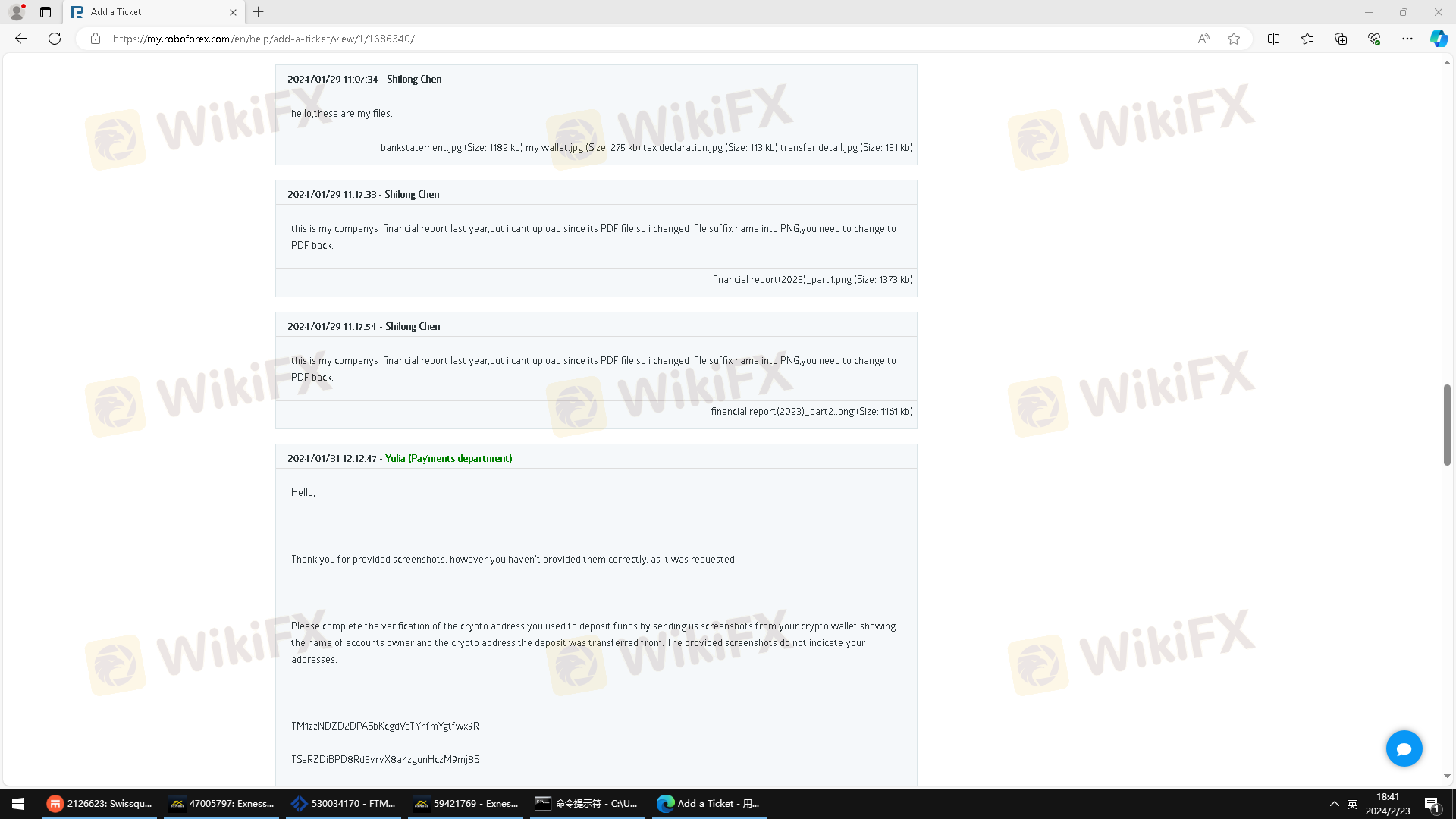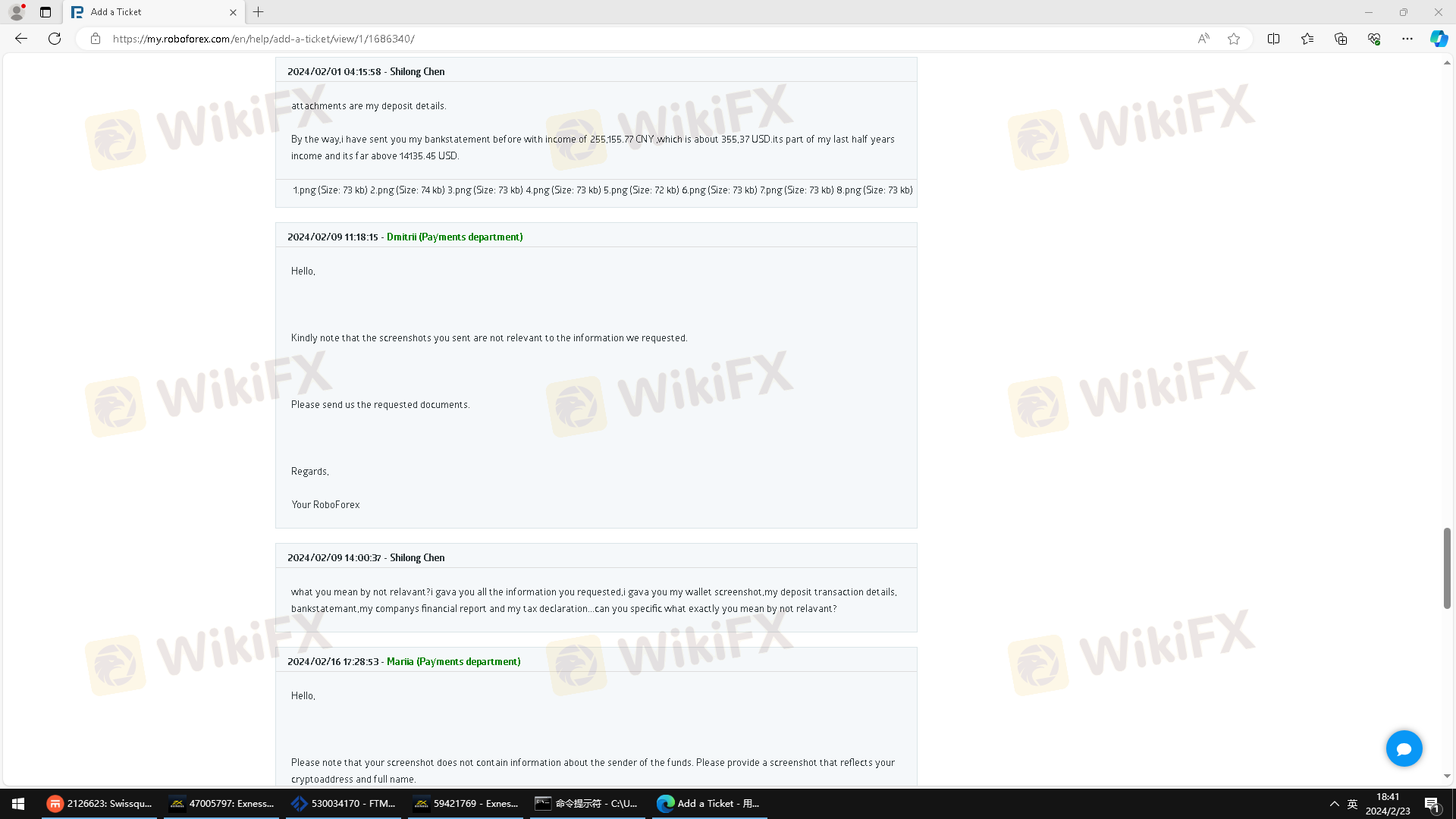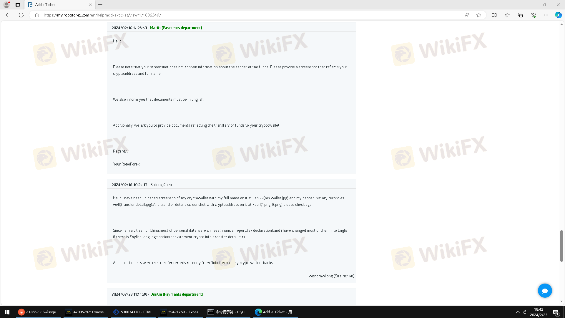 在roboforex交易了半年多,去年年底想出金,他们拒绝了我的请求,让我提交各种资料证明资金来源之类的。当我大费周折把这些文件准备好了之后,他们一直敷衍了事,不给我出金,老是找这样那样的理由推脱我,现在已经拖了好几个月了,还是无法出金。本人 交易账号:37083142。附件是我和他们的聊天记录