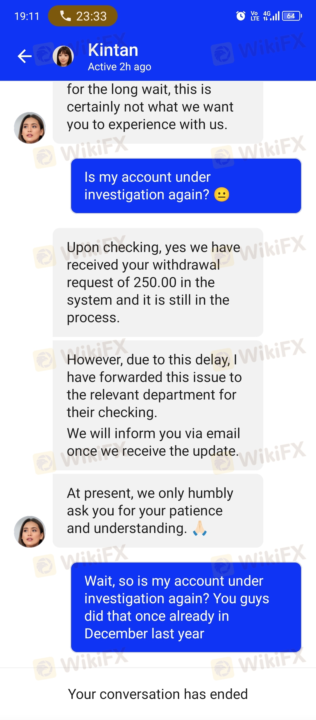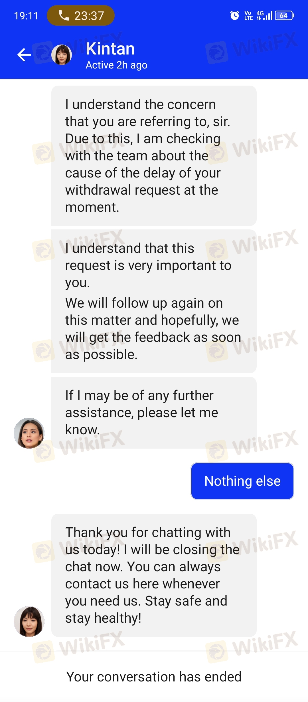 They have more than 20 chat agent (fake name and fake profile pictures) and they all say the same thing when I ask why is my withdrawals not approved. 'We forwarded this case to the relevant team' 'We will get back to you soon, rest assured'. They are not giving any relevant answers to my inquiry. (Screenshot attached)