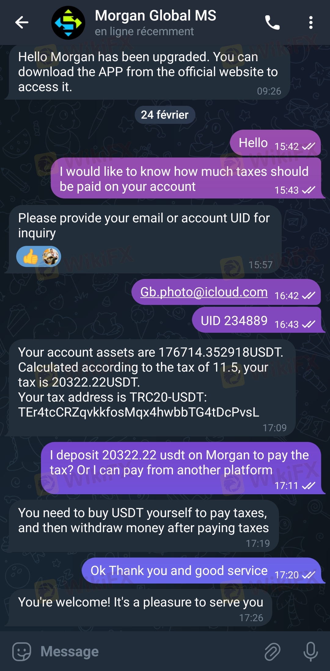 Après plusieurs mois de conversation elle mas fait croire qu'elle a investi sur une plateforme du nom de GLOBAL MORGAN