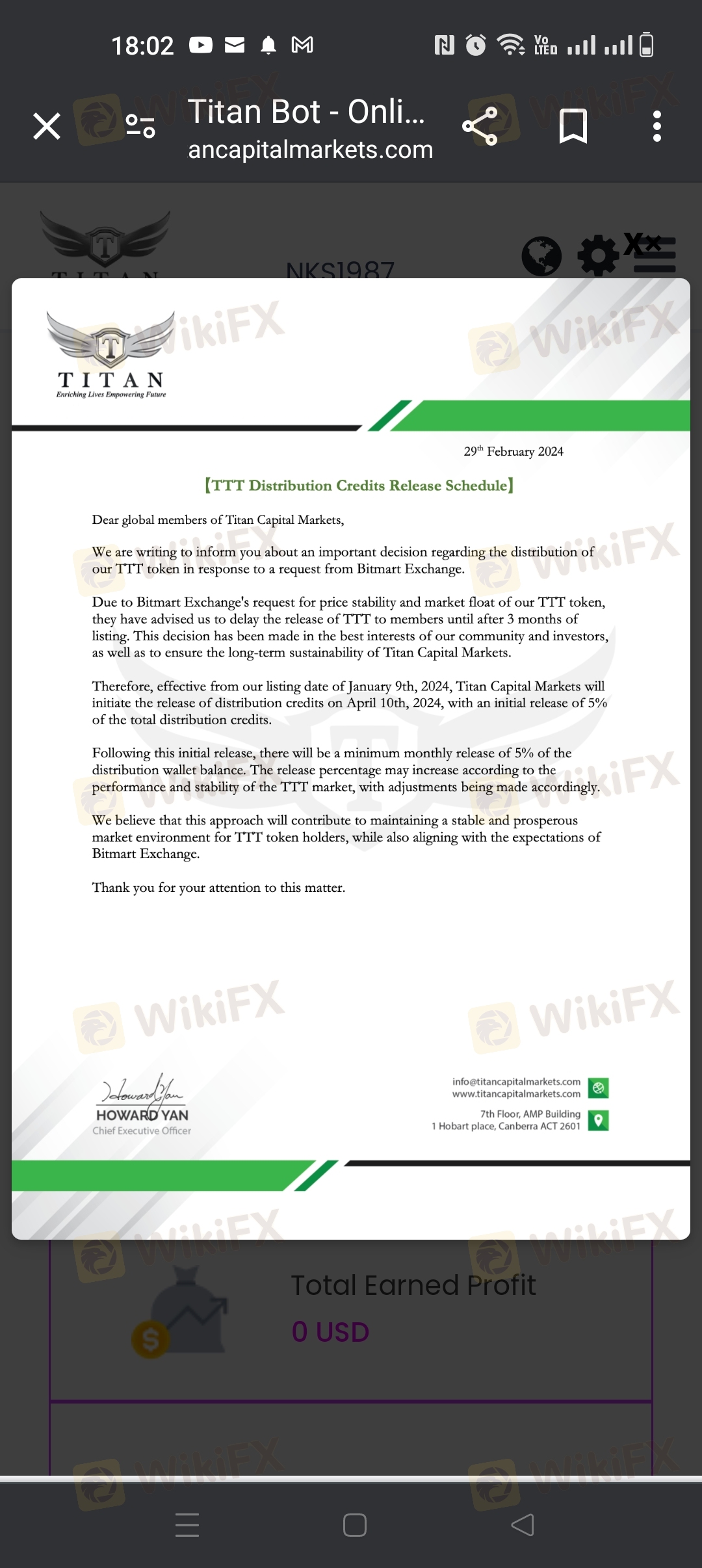 I urge Titan Capital Markets to immediately address this issue and honor the original agreement by removing any impediments to withdrawals from wallets. Failure to rectify this situation promptly will force me to consider taking further action to protect my interests and seek restitution for any losses incurred due to these unjustified restrictions.