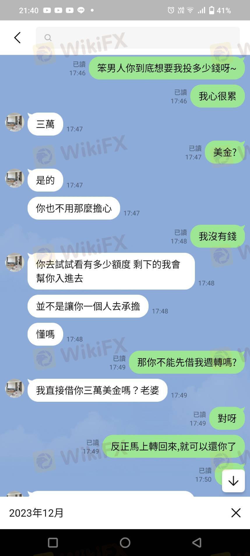 加好友後每天聊天三餐問侯關心、甜言蜜語,也聊到生活狀況,他一直說希望能改義我的生活,並且說女人要有自已的小金庫,他自已就因為疫情所以有被隔離期間是沒有收入的,後來自已就專心的研究國際黃金,也是有所收益,他說會帶我一起做。