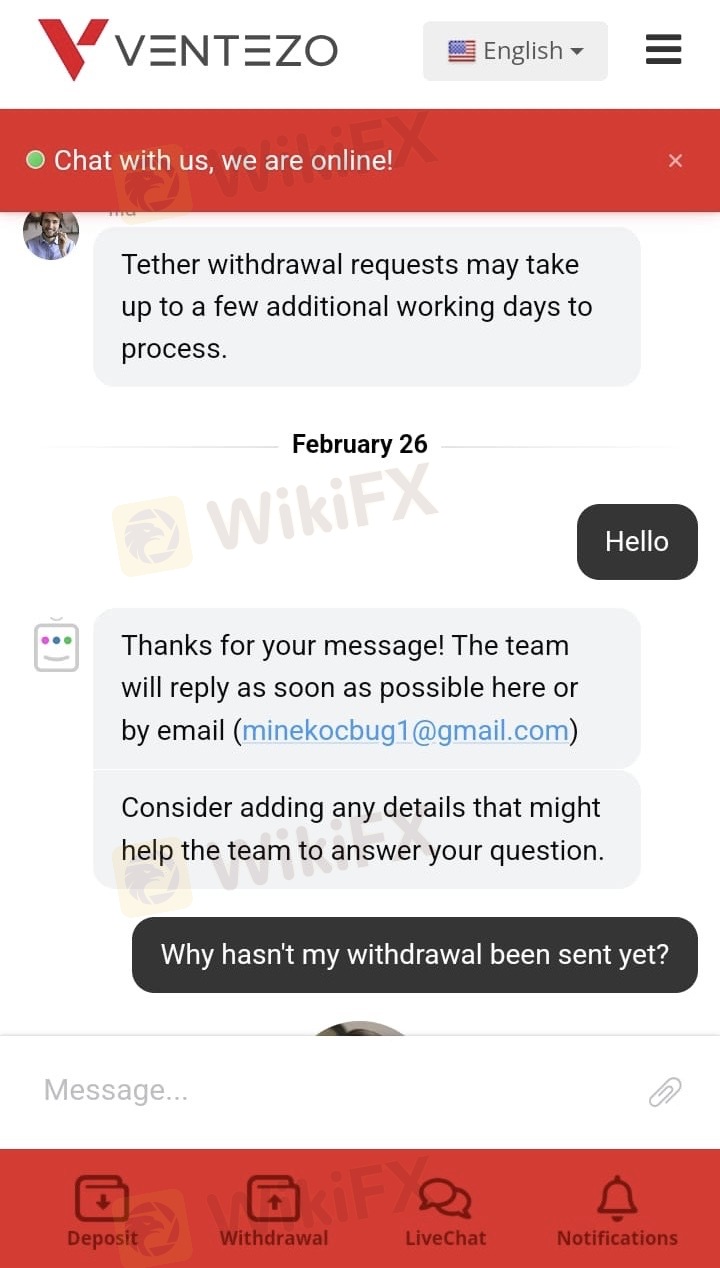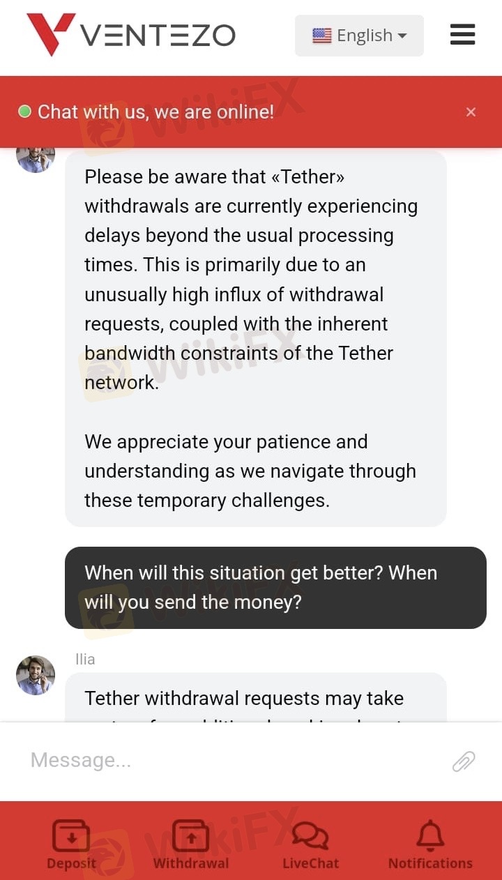 Ventezo company has not sent my money for more than 30 days, it has usurped my money for 30 days, and when I wrote live support, they first said that there was a malfunction in our cryptocurrency withdrawal and that we would send your money soon, and then they constantly say that the finance unit will return to you as soon as possible, and they constantly tell me to be patient and wait