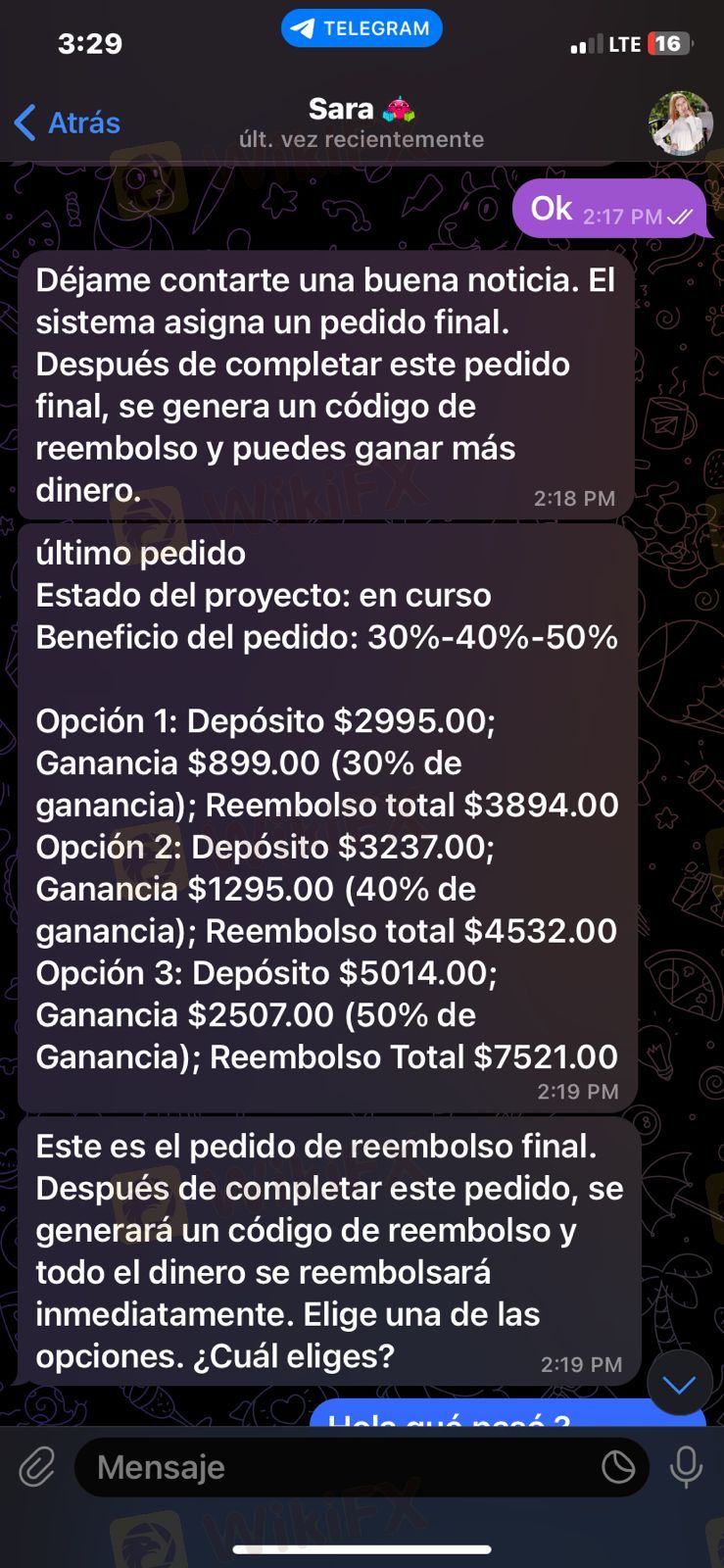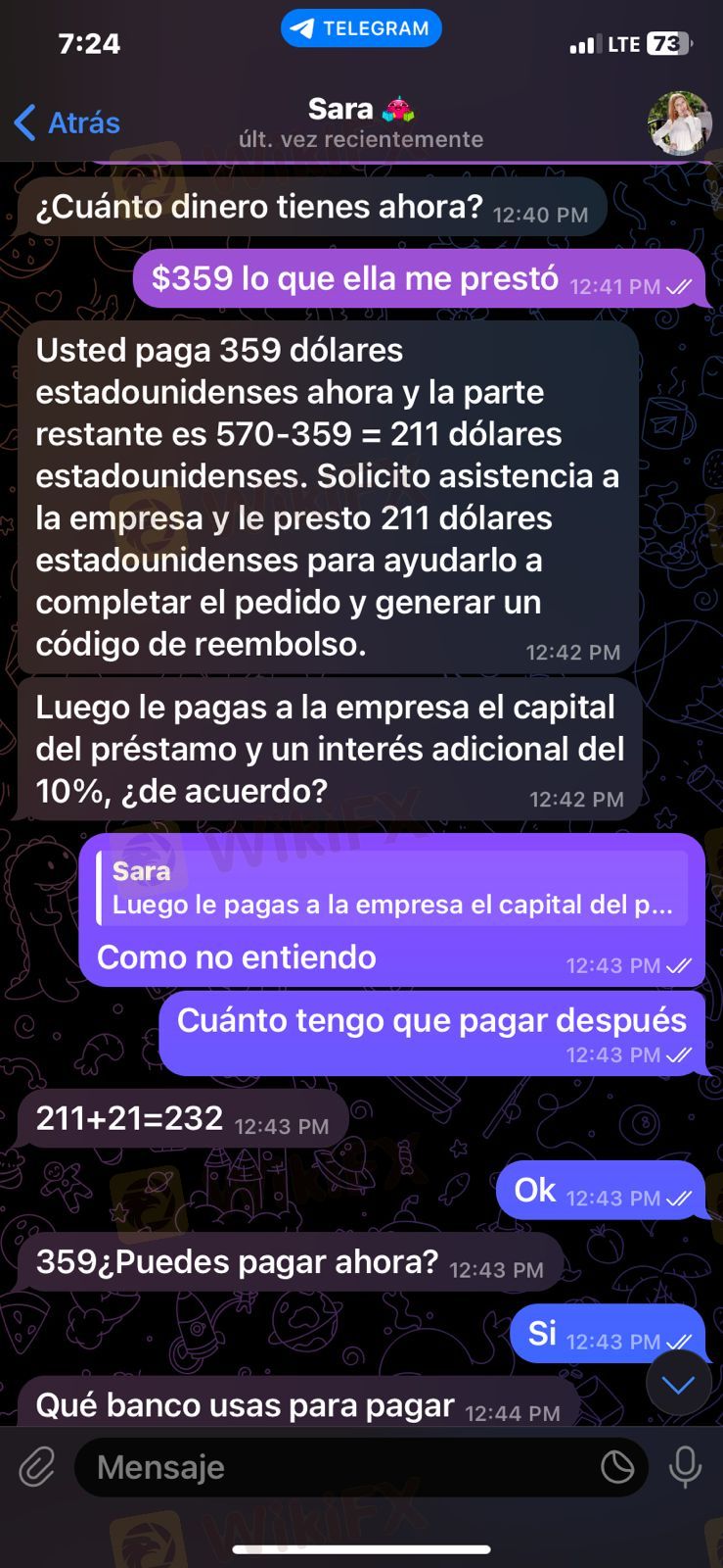 fui estafada atravez de un grupo de telegram me llego un mensaje el cual decia que ganaria 300 a 500 usd por dia me comenzaron pagando 5 al dia despues me pidieron depositar a travez de cuentas bancarias y yo deposite 459 dolares me mintieron diciendome que me reembolsarian 900 ya habia invertido 100 y por no perderlos inverti mas y me estafaron porque no recupere nada perdi mi dinero me estafaron
