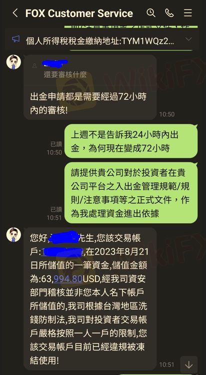透過Tinder認識女性網友並交換Line ID進一步認識深入聊天以結婚為前提下, 女方提到蜜月旅行所費不貲, 進而介紹本人投資美股指數賺大錢女性網友介紹使用Fox Global交易平台(以USDT)投資外匯 本人資金入出金歷程(幣託-Fox Global), 大筆資金流入Fox Global平台之個人帳戶, 僅早期一筆小額資金(USDT168)成功出金到幣託(Pitopro)本人經過一段時間投資操作Fox Global平台, 並獲利後首度申請出金USDT1,000,0004.3 本人收到Fox Global客服要求先繳納所得稅金USDT112,224, 方能收到所提出之出金金額及再次提領帳戶餘額, 若過期限不繳納則需補繳3%滯納金(每天)成功繳納所得稅金到 Fox Global指定之虛擬錢包地址女性網友自稱幫本人提高投資本金, 主動提領其幣託帳戶資金到我的Fox Global個人平台並提供資金憑證作為證明本人承諾待我能從Fox Global出金投資獲利及本金後, 隨即將借款(USD63,994.8)返還女性網友, 並經女性確認且同意此方式Fox Global客服要求本人必須對該筆非本人名下儲值金USD63,994.8以本人名義進行重新儲值, 方能重新啟動所提之出金申請流程此時啥驚覺被騙