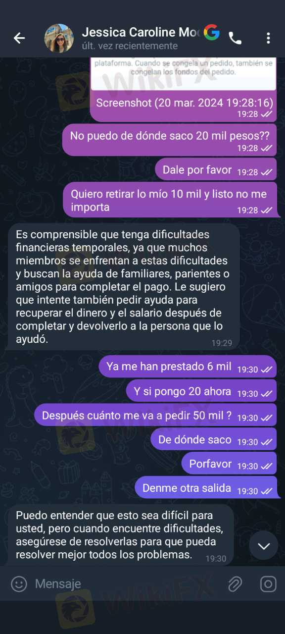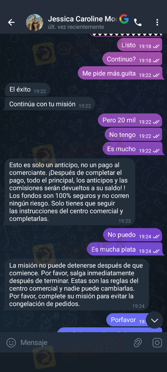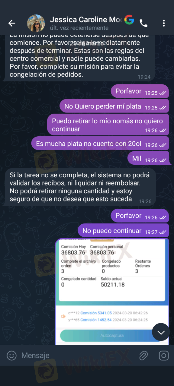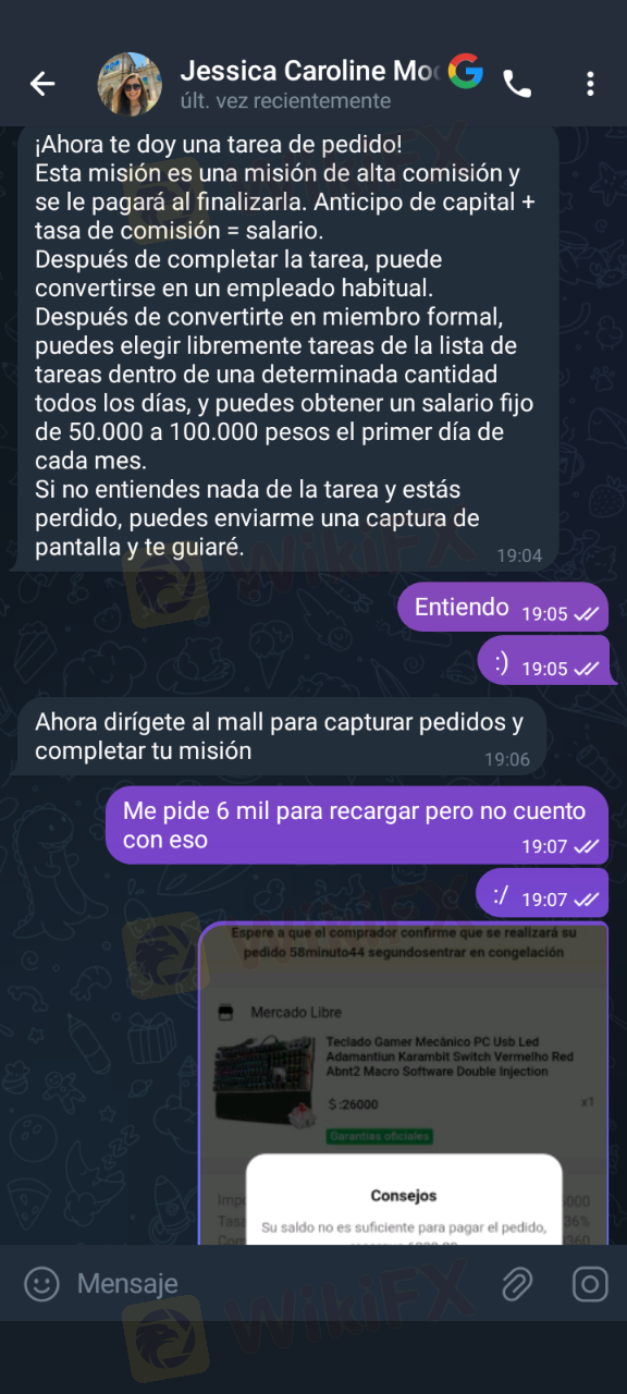 De una supuesta página de mercado libre para ventas y generar comisiones , me han echo empezar con 1.000$ pesos argentinos y luego hacer tareas para sumar comisiones pero las tareas te piden cargar plata para poder continuar y 30 mil pesos argentinos. Quiero recuperar lo mío porfavor te contactan por telegram y te van diciendo q hacer cuánto depositar para seguir y así 13 mil pesos argentinos me estafaron .