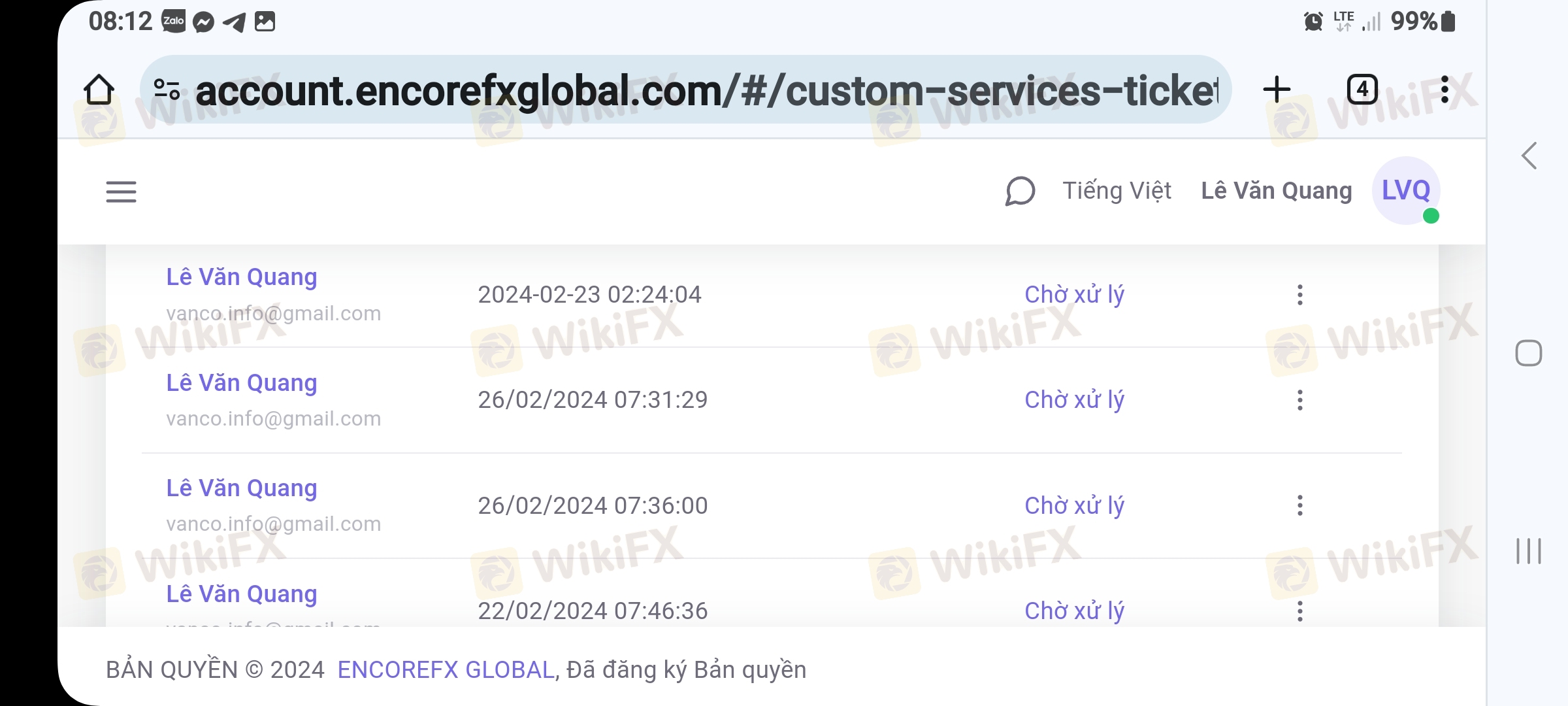 tôi có đầu tư bên sàn encorefx global tổng số tiền đầu tư 7500usd có rút về 3158.98 usd bị thua lỗ 2110.08usd số tiền còn lại trong tk là 2230.94usd ngày 19/2 tôi không thấy có cổ tức của mã cp siemens tôi thắc hỏi bạn tư vấn không thấy trả lời.gọi điện thì không nghe máy song rồi tắt máy luôn.tôi liền gửi mail cho support bên sàn hỏi không thấy trả lời.tôi lại gửi lại mail khác cũng không thấy hồi âm .và tôi vào trang chủ rút tiền thử thì thấy không nhập được lệnh rút tiền.tôi lại gửi mail hỏi support vẫn khồn trả lời và kết quả là tôi bị khóa luôn cả tk trang chủ và tk mt5.giờ tôi không biết tìm ai để hỏi lí do tại sao tôi bị khóa tài khoản.vậy tôi viết lên đây nhờ cộng đồng giúp đỡ có thông tin gì về sàn encorefx global giúp tôi để tôi lấy lai số tiền tôi đã bị sàn này lừa đảo và chiếm đoạt
