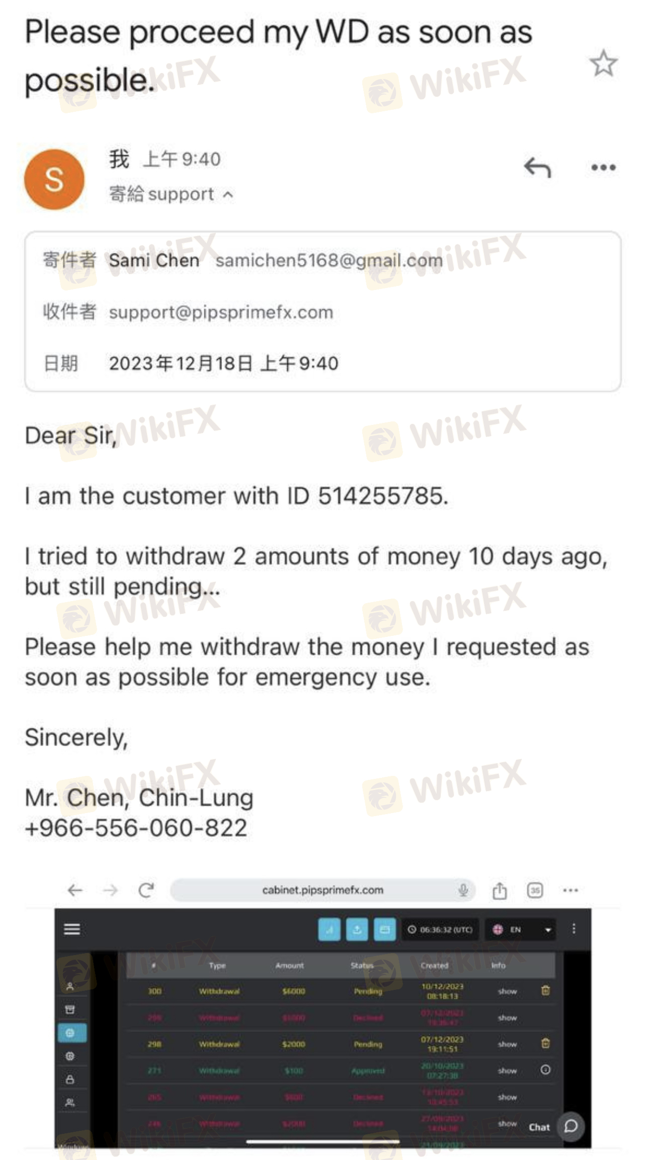 I tried to withdraw 2000 USD and 5000 USD separately to my Binance account and bank account on 7th December, 2023, then I cancelled the withdrawal of 5000 USD and change the withdrawal amount to 6000 USD on 8th December, 2023. Since then, the broker has never replied my withdrawals until now.