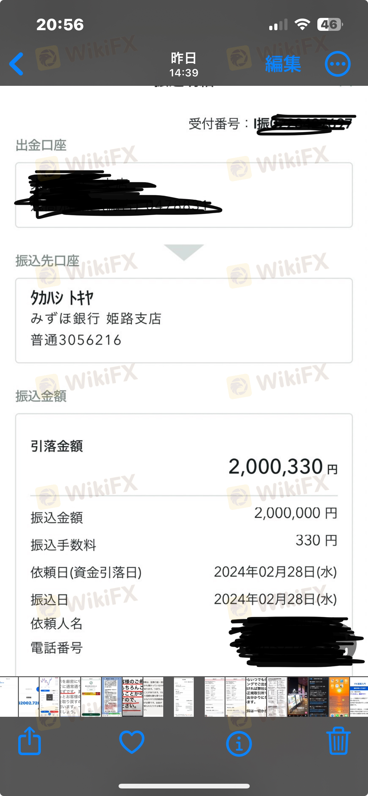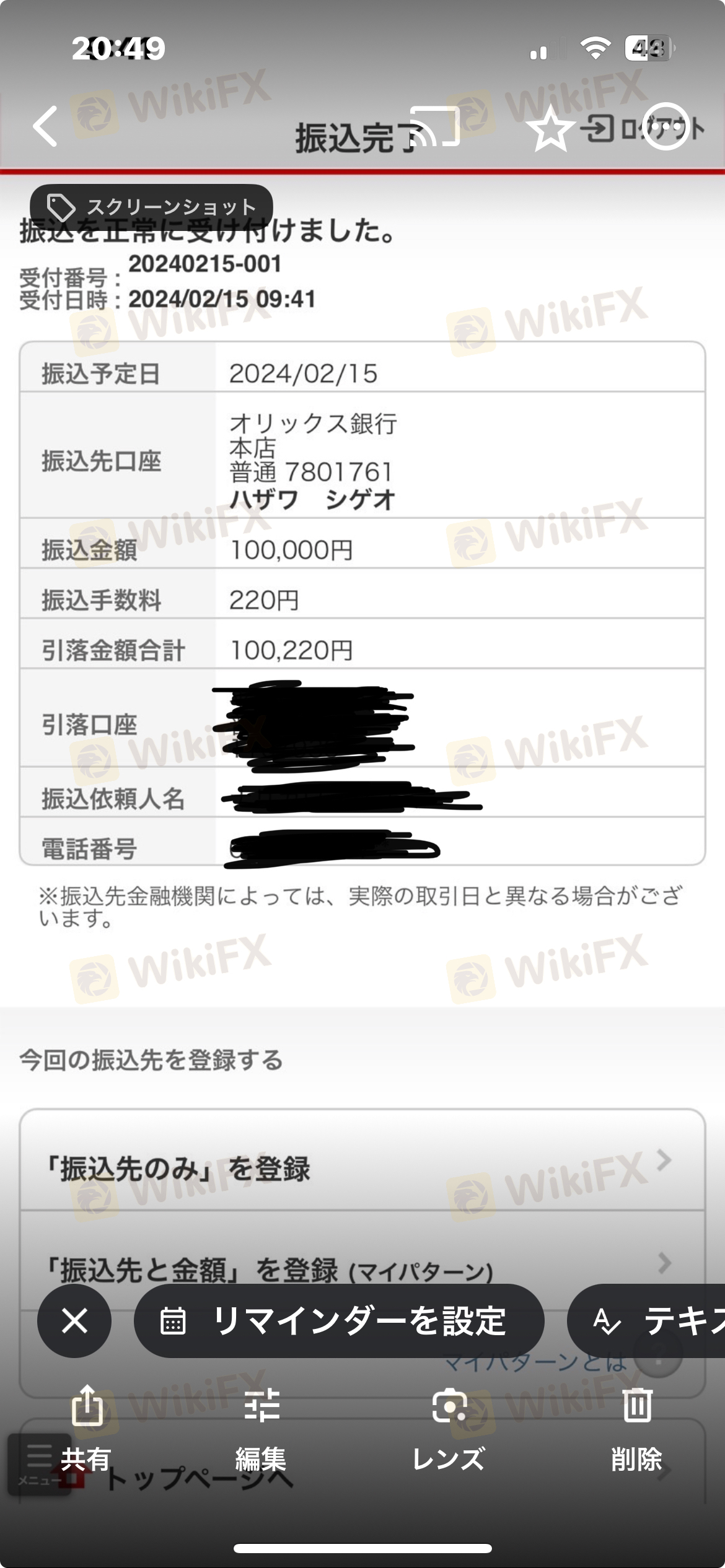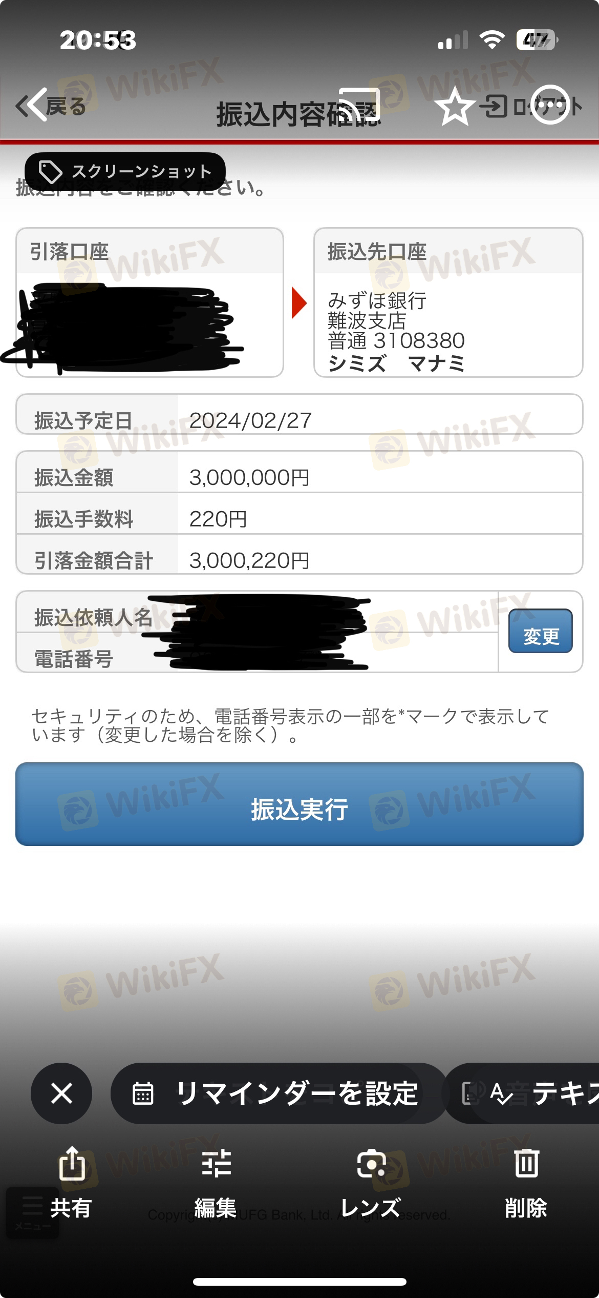 1ヶ月以上経って40000ドルの出金をしたい旨を担当者(徳島正治)に伝えると、取引所アプリから手続きするように言われそのようにする。しかしなかなか振り込みはされず、何度か問い合わせた後利益分に対する税金を払わないと出金できないとの回答。そもそも出金に条件があることなど一切説明を受けておらず、そのことに対して問い合わせても明確な返答はなし。