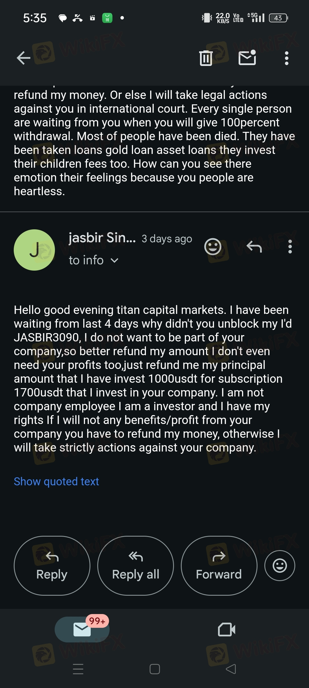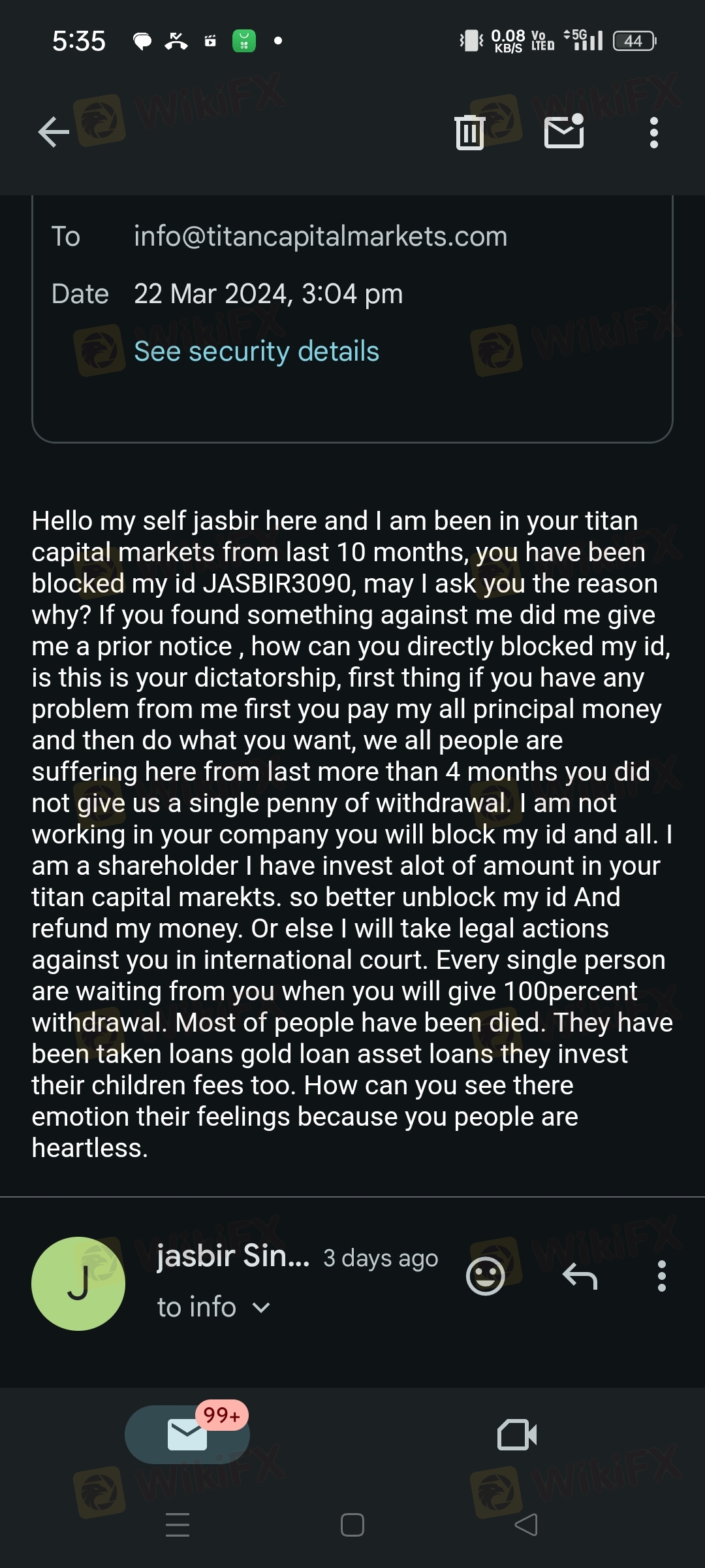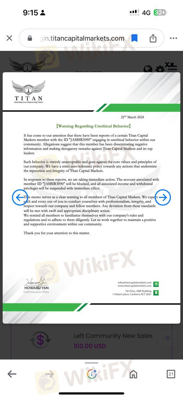 hello my self jasbir singh from india, titan capital markets blocked my I'd username JASBIR3090. without giving me prior notice. they can give me waring they can ask me what is my issues in titan capital markets, instead of that they blocked my id. I am not an employee of their company , I am an investor if they have problem from my side they refund my amount with my subscription package I don't require there profit. we all people are waiting for more than 4months (likely December month) for our 100 percentage withdrawal. now they will give us only 5 percent withdrawal from our staking profit. and our principal amount is also they are not giving us as by they said. I can give you all the proofs regarding this matter. how can we trust on you also. you have to look in this matter because every people invest via loans they sell their property childern FD FUNDS. NOW CAN THEY SURVIVE. I NEED MY FUND BACK FROM THESE KIND OF FAKE COMPANY I DONT WANT THEIR SINGLE PROFIT. and I mail them they didn't even replied me. my total fund invest in my id is with subscription 2700usdt without profit.